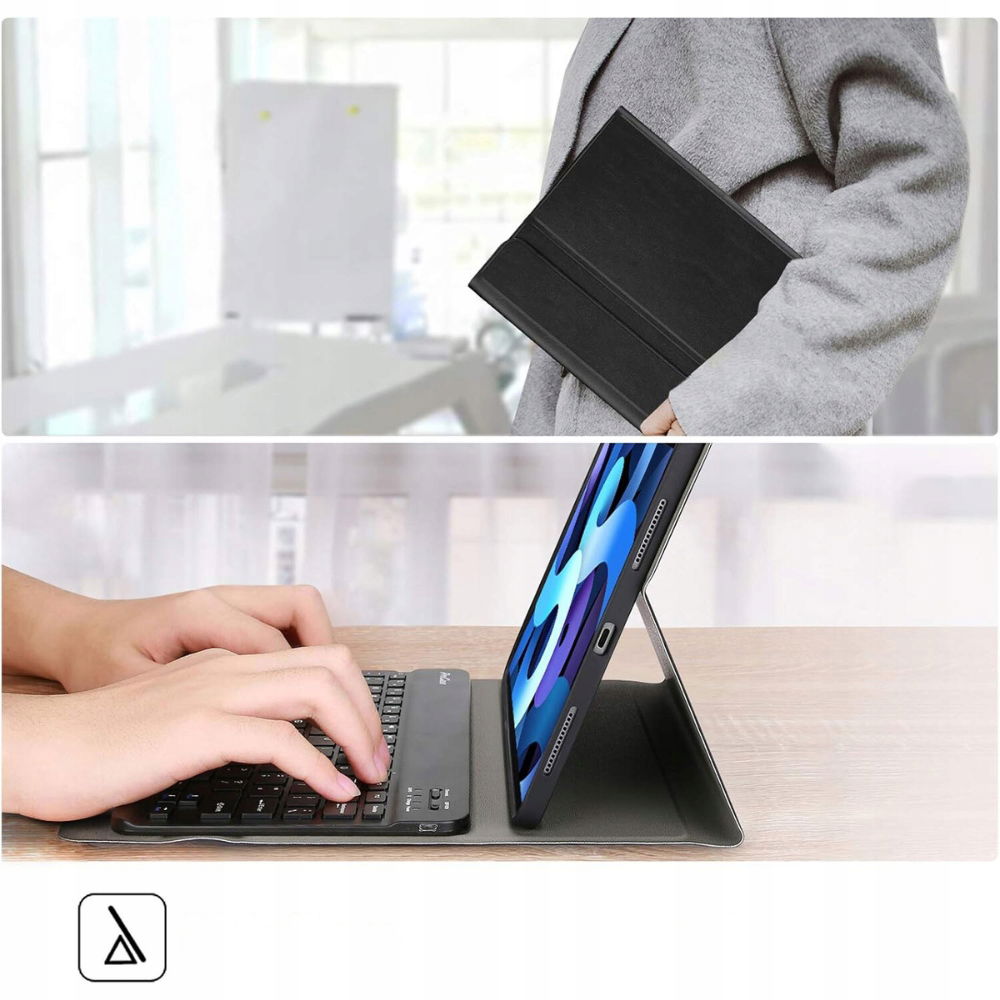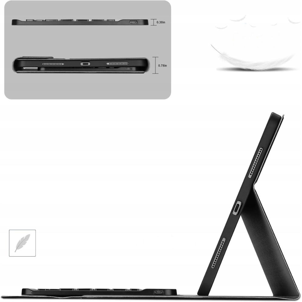 Etui jest wyjątkowo smukłe i lekkie, co sprawia, że łatwo zmieści się do torby czy plecaka. Wbudowane w etui trzy wgniecenia umożliwiają regulację kąta nachylenia iPada, pozwalając na wygodne oglądanie treści lub pisanie. Dzięki ultracienkiej konstrukcji klawiatury (7 mm) i jakościowemu mechanizmowi sprężynowemu, pisanie jest komfortowe, a reakcja przycisków szybka i precyzyjna.