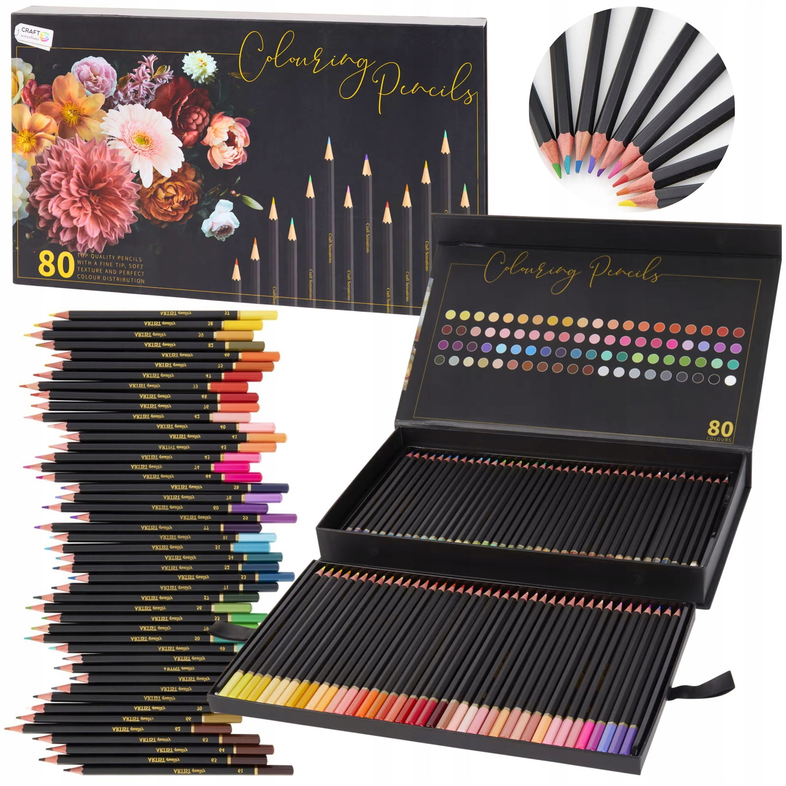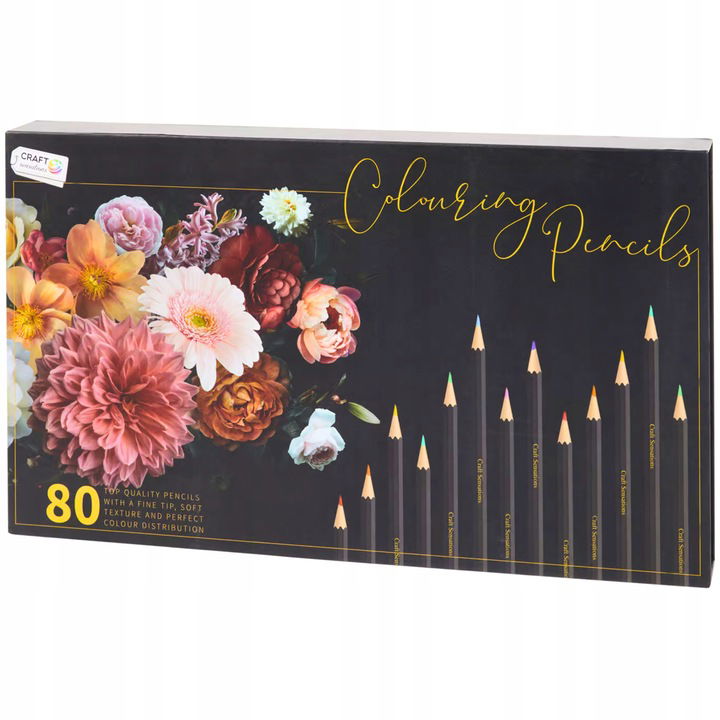 Kredki doskonałej jakości z cienko zaostrzoną końcówką, o miękkiej teksturze i z doskonałym rozkładem kolorów. Kredki ołówkowe duży zestaw aż 80 sztuk. Talent plastyczny wymaga wsparcia - najlepiej jeśli osoba rozwijająca się malarsko lub rysunkowo otrzyma je w postaci solidnego sprzętu lub akcesoriów. Profesjonalne kredki Craft sensations mogą posłużyć nie tylko do nauki rysowania, ale zapewnią też pełną gamę kolorów w poważniejszych przedsięwzięciach. Piękne etui kojarzy się z artystyczną solidnością. 46 kolorów wystarczy, by wyczarować dowolny klimat na każdej ilustracji, której treść będzie ograniczać jedynie wyobraźnia autora. Zestaw zawiera również bardzo nietypowe odcienie i kolory przejściowe, umożliwiające podjęcie się nawet bardzo wymagających artystycznie wyzwań. Do zabawy, nauki, tworzenia - zawsze w najlepszym wydaniu. Kredki są przeznaczone zarówno dla najmłodszych, jak i dla doświadczonych adeptów rysowania. Elegancki komplet może okazać się znakomitym upominkiem dla miłośnika sztuki czy młodej osoby z dużym talentem plastycznym. Wraz z innymi profesjonalnymi akcesoriami będzie w stanie wydatnie pomóc w podnoszeniu twórczych umiejętności.