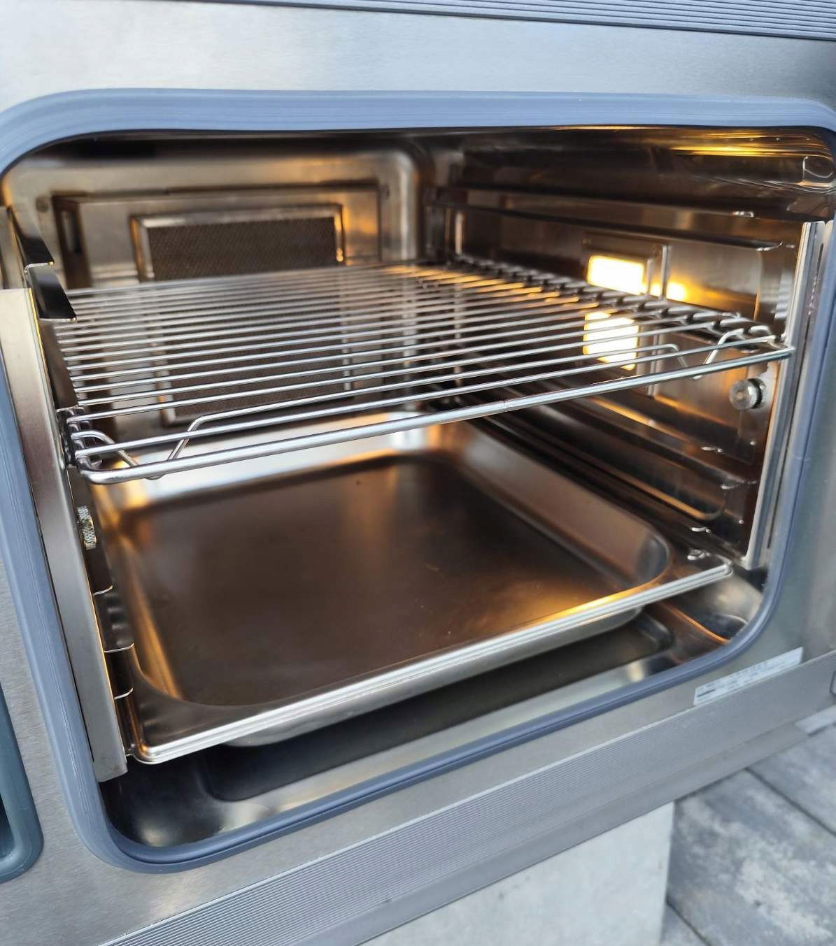 - Wnętrze piekarnika – czyste, dobrze utrzymane, z rusztem i blachą