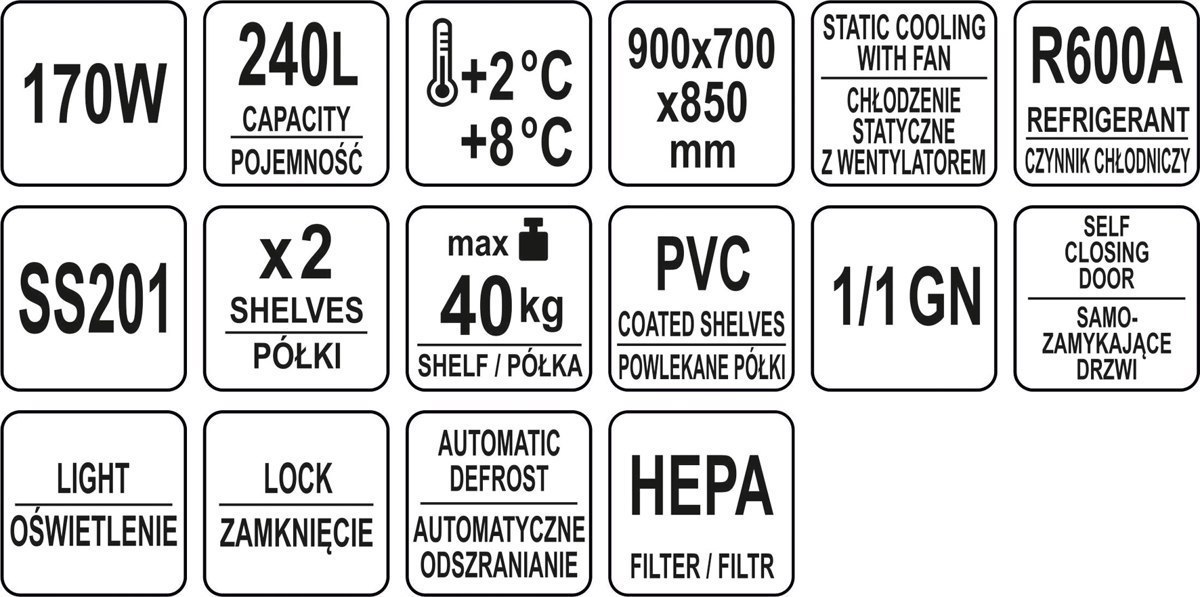 Stół chłodniczy o wymiarach 900x700x850mm ma pojemność komory 240L