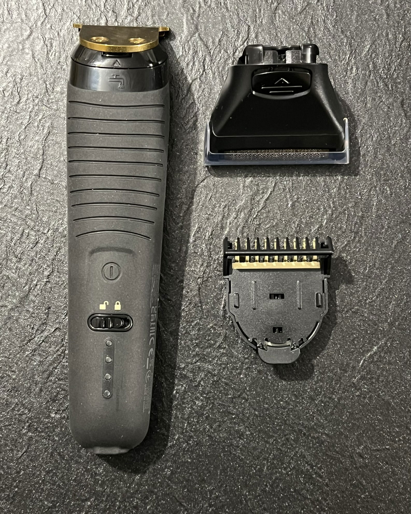 Precyzyjny grzebień (1,5–5 mm), 9 nasadek do włosów i brody (1,5–25 mm), standardowa nakładka goląca z folią, wysokiej jakości ostrze T o długości 38 mm do włosów i brody.