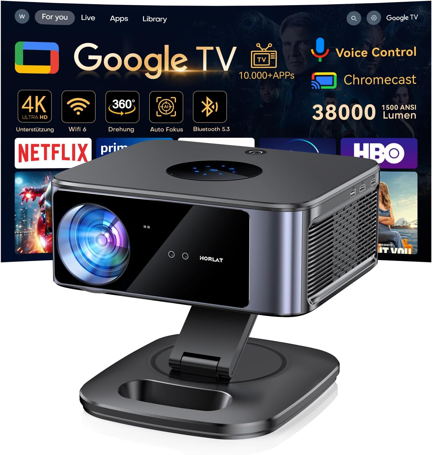 PROJEKTOR HORLAT 1500 ANSI GOOGLE TV 4K WIFI 6 AUTO-FOCUS 360 C129