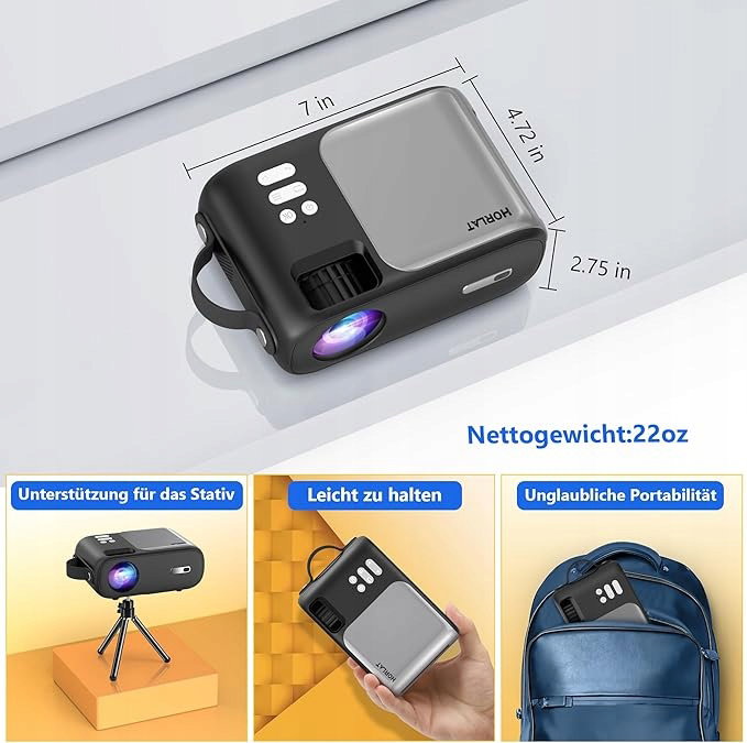 HORLAT Mini projektor do iPhone'a, projektor Bluetooth 5G, WiFi, 9000 l, HD 720P, przenośny projektor zewnętrzny z korekcją trapezową 4P i zoomem, projektor kina domowego do gier/PC/TV Stick