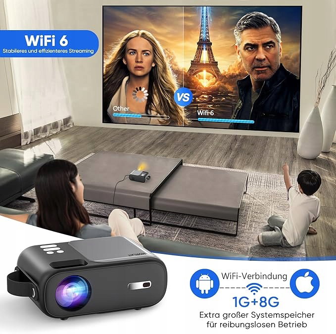 - Najnowsza technologia synchronizacji ekranu WiFi i łączność Bluetooth – mini projektor ma dwuzakresowe Wi-Fi 5G + 2,4 G i jest wyposażony w pamięć biegową 1G + 8G. Dzięki wbudowanemu systemowi Eshare ekran nie opóźnia się już podczas lustrzania ekranu smartfona podczas oglądania filmów lub gier. Bluetooth 5.1 sprawia, że synchronizacja dźwięku jest szybsza i bardziej stabilna, a jego odległość transmisji jest 4 razy większa niż w przypadku innych projektorów Bluetooth, dzięki czemu możesz zamienić go w kino domowe w dowolnym miejscu!