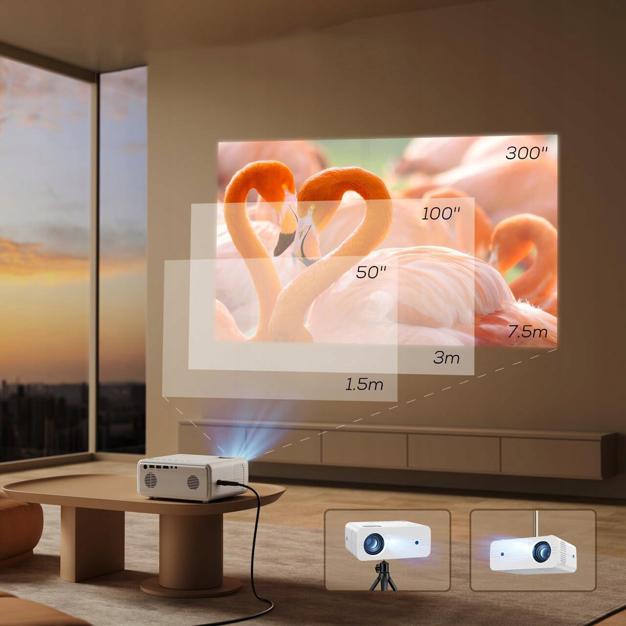 Projektor oferuje natywną rozdzielczość Full HD 1920 × 1080 oraz jasność 200 ANSI lumenów, co przekłada się na wyraźny, szczegółowy obraz o naturalnych kolorach. Obsługiwana przekątna projekcji od 40 do 300 cali pozwala stworzyć prawdziwe kino domowe zarówno w sypialni, salonie, jak i na tarasie.