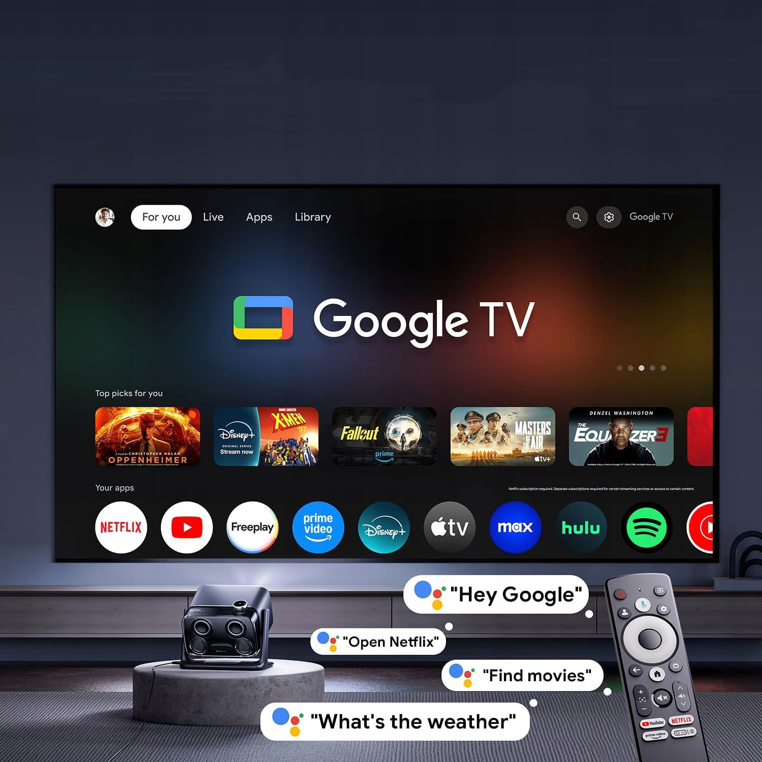 Projektor posiada oficjalny system Google TV, który zapewnia bezpośredni dostęp do popularnych aplikacji streamingowych, takich jak Netflix, YouTube, Disney+ czy Prime Video (wymagane aktywne subskrypcje). Wszystkie treści dostępne są bez potrzeby podłączania zewnętrznych przystawek – wystarczy włączyć projektor i rozpocząć seans.