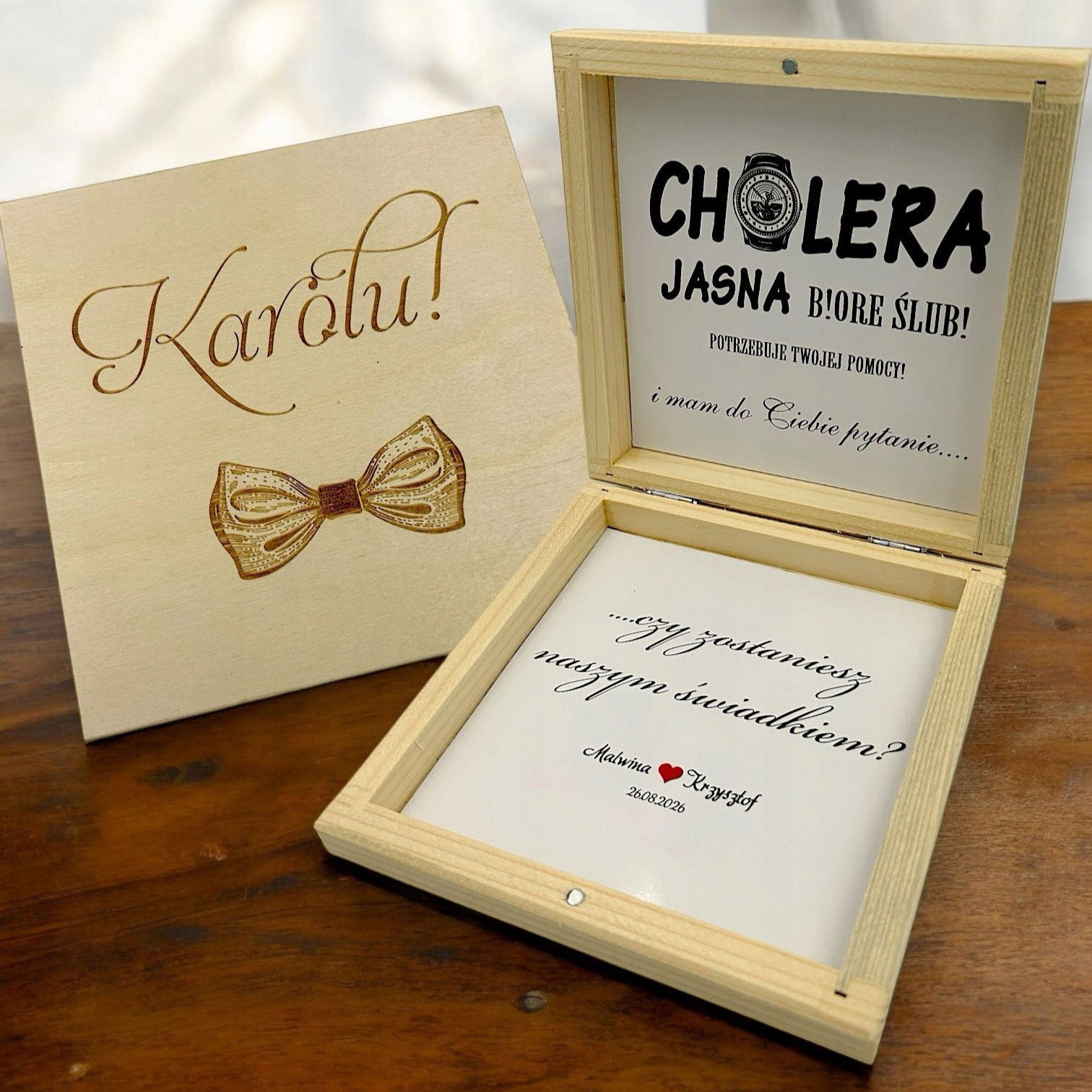 Prośba o Świadkowanie w Drewnianym Pudełku Zaproszenie Dla świadka w pudełku z Grawerem - Czy zostaniesz moim świadkiem.