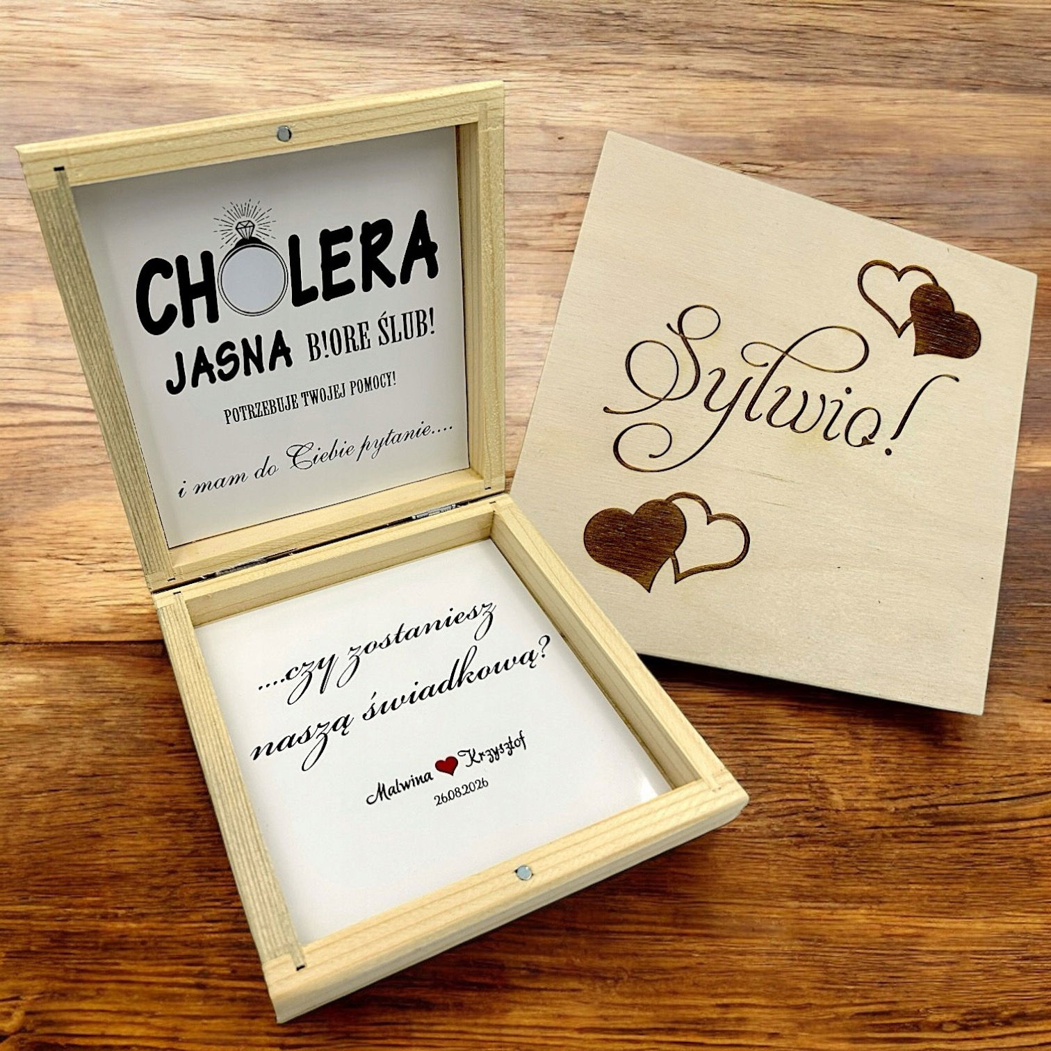 Prośba o Świadkowanie w Drewnianym Pudełku Zaproszenie Dla Świadkowej W Pudełku z Grawerem - Bez Ciebie Nie Idę.
