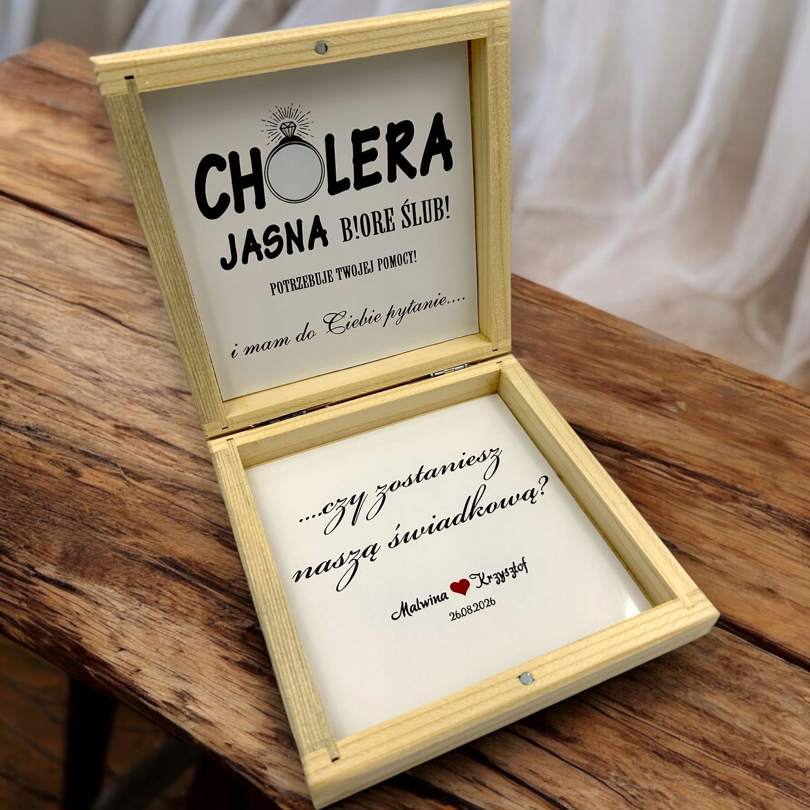 Powiedz Twojej przyszłej świadkowej, że bez niej nie idziesz – wręcz jej zaproszenie na ślub dla świadkowej w pięknym drewnianym pudełku.
