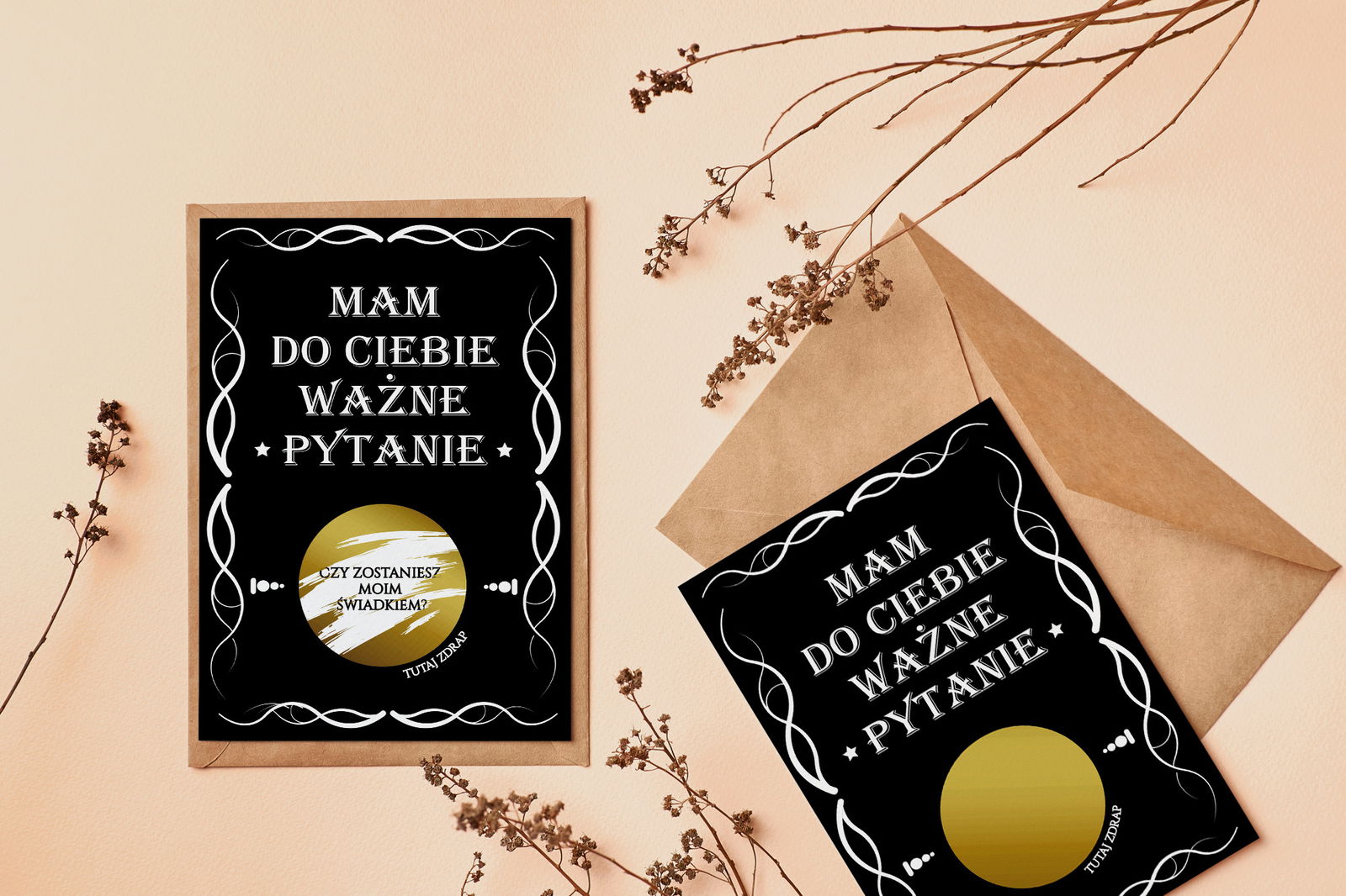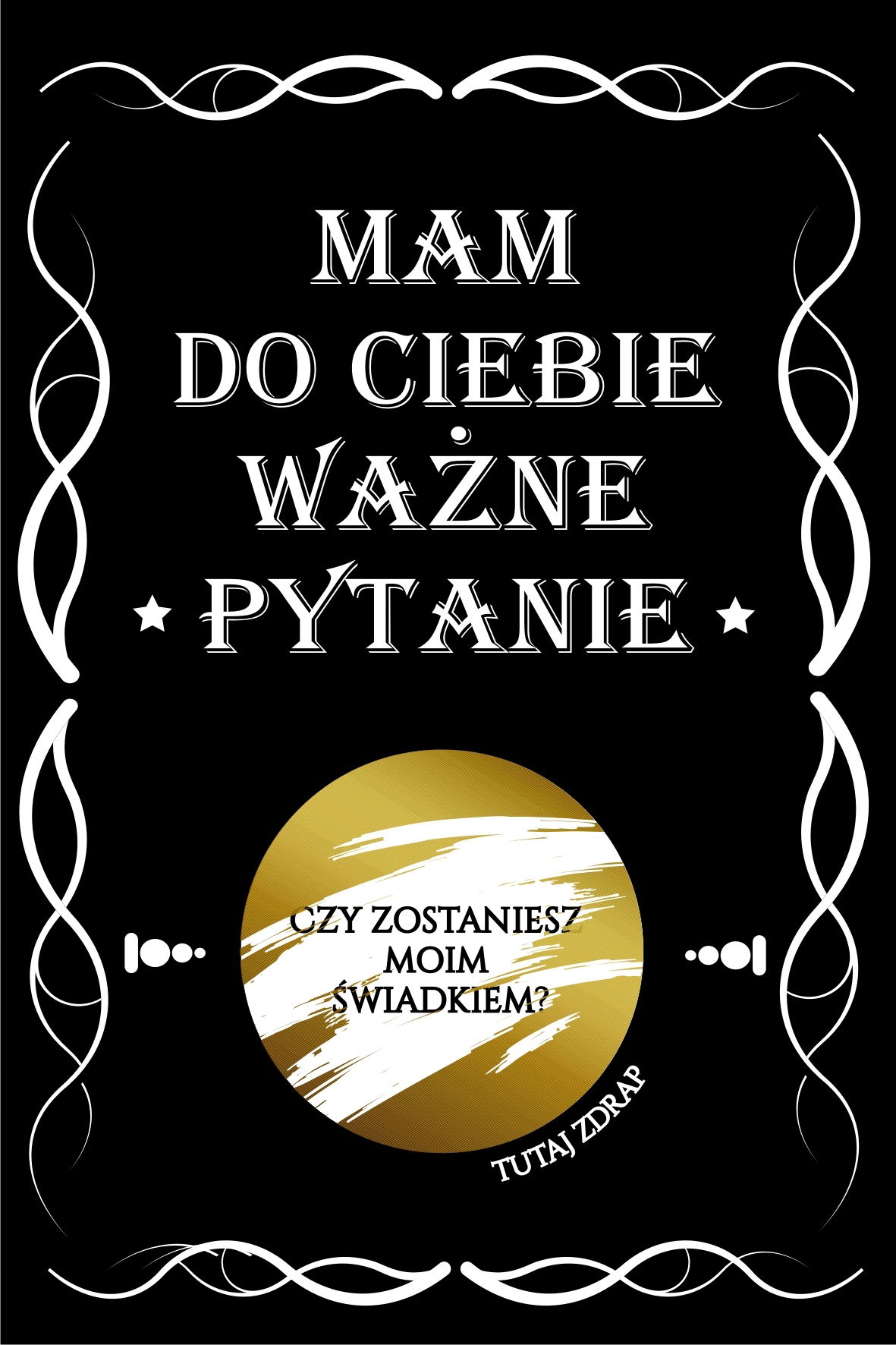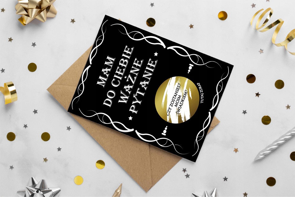 Oryginalny pomysł na spytanie o świadkowanie. Kartka ze zdrapką, pod które znajduje się pytanie do świadka, czy zostaniesz moim świadkiem?
