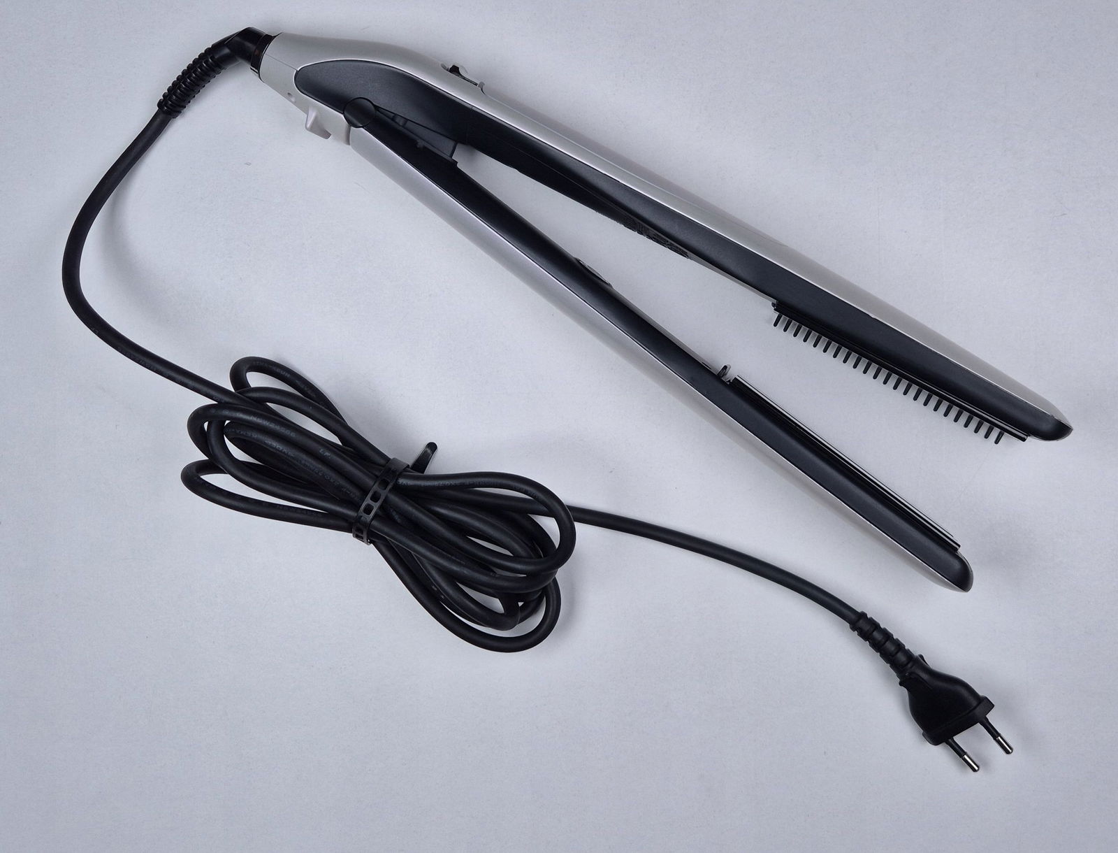 - Zdejmowany grzebień – ułatwia prowadzenie prostownicy przez włosy, zapobiegając plątaniu i zapewniając równomierne rozprowadzenie pary.