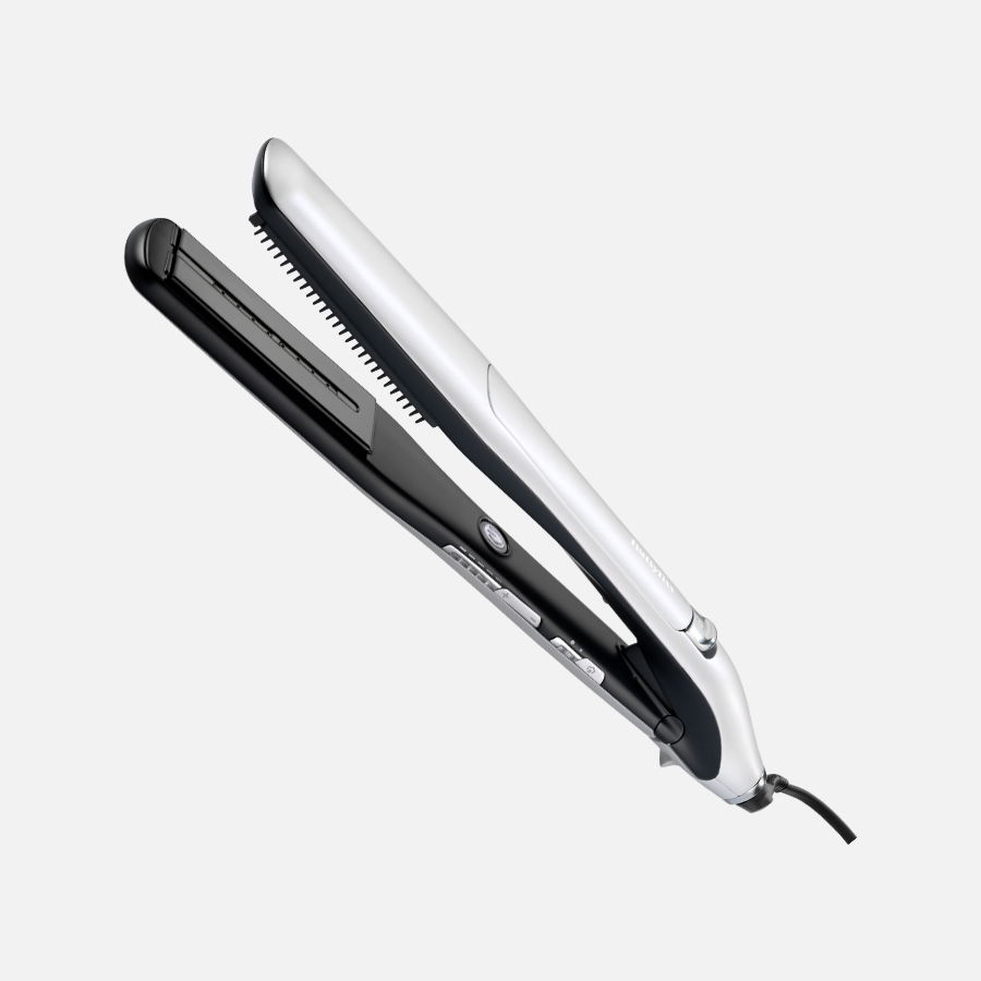 Prostownica do włosów z technologią mikro pary, gwarantuje odżywienie i połysk dzięki podwójnej sile pary z 16 dysz, 8 górnych i 8 dolnych na obu płytkach pozwala parze lepiej wniknąć w głąb włosa, jednocześnie go nawilżając, płytki ceramiczne, 5 ustawień temperatury od 170 do 210°C, automatyczne wyłączenie, 2 ustawienia intensywności wyrzutu pary, zdejmowany grzebień, szerokie 39 mm płytki.