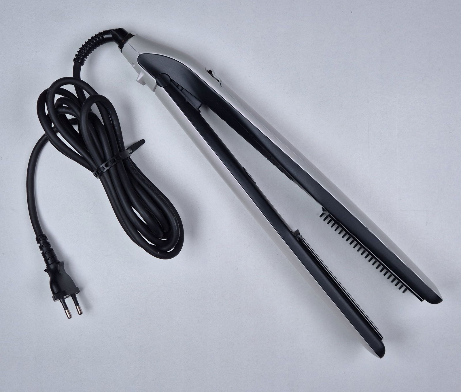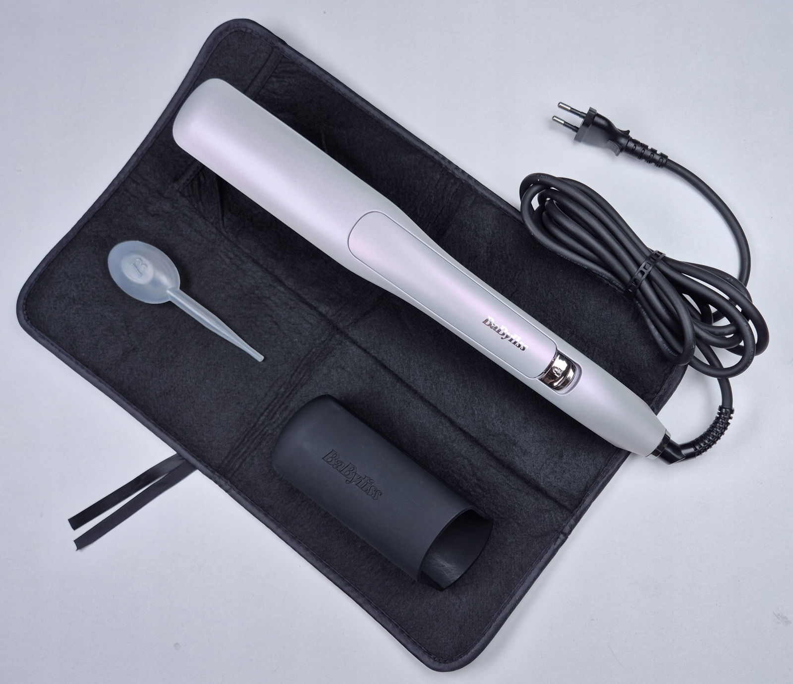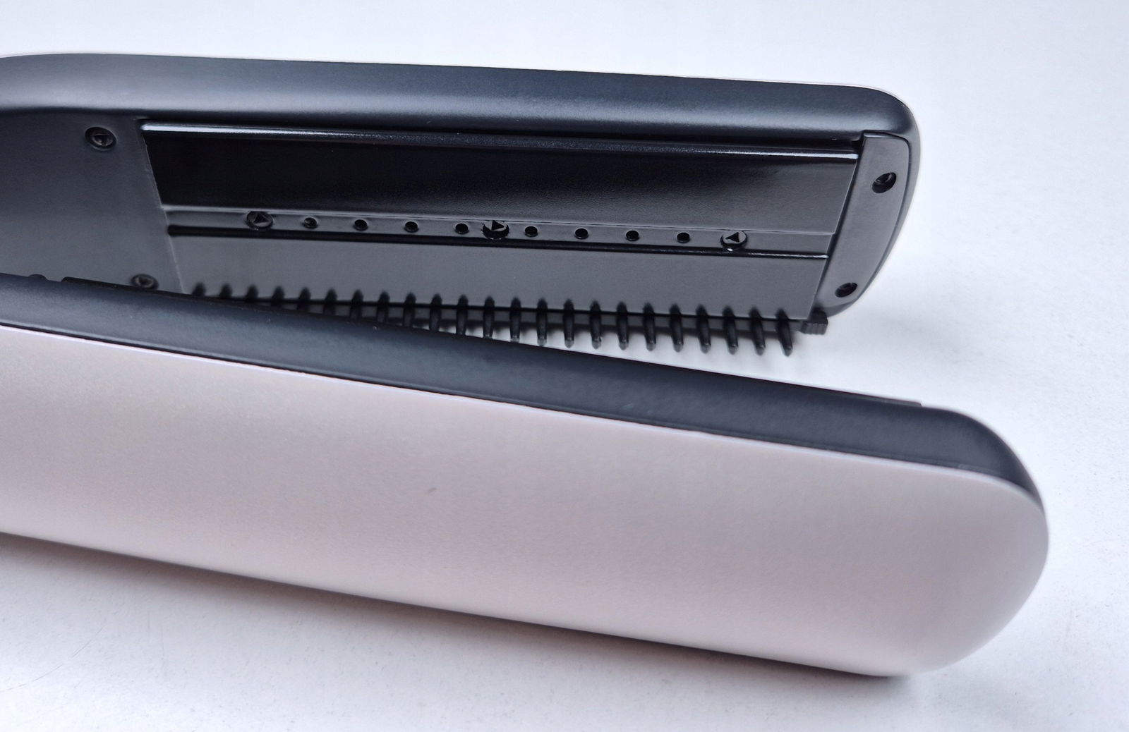 - Zdejmowany grzebień – ułatwia prowadzenie prostownicy przez włosy, zapobiegając plątaniu i zapewniając równomierne rozprowadzenie pary.