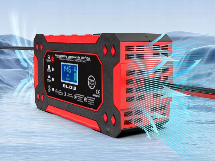 Prostownik został wyposażony w wentylator, który dba o prawidłową temperaturę pracy urządzenia oraz zapobiega przegrzaniu.