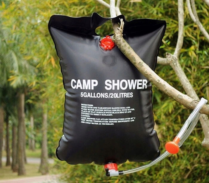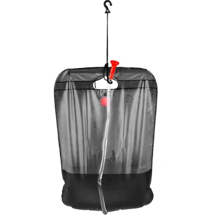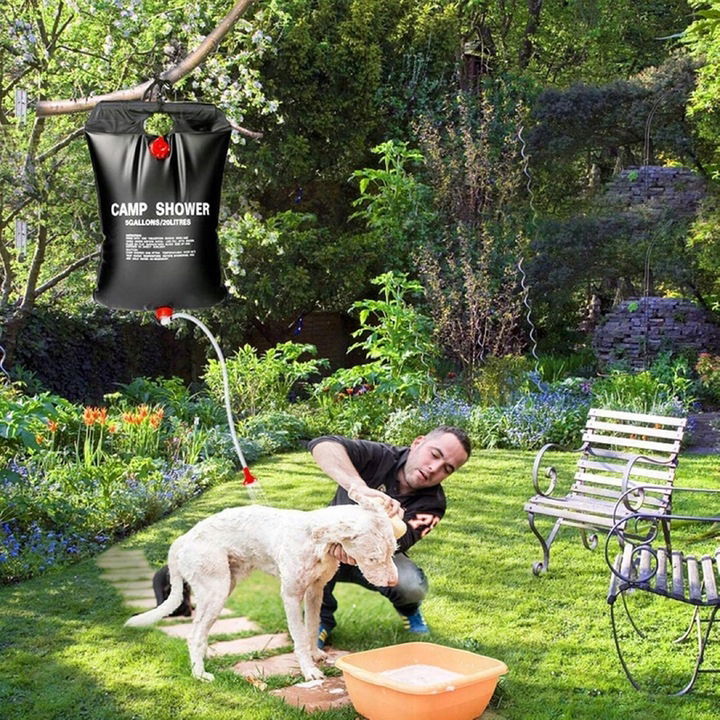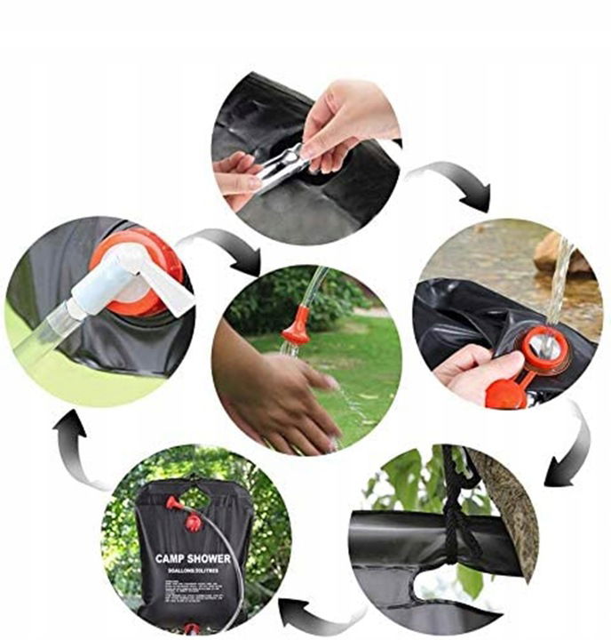 Wygodny prysznic kempingowy o pojemności 20 litrów, idealny dla miłośników outdooru. Prosty w montażu, wytrzymały i łatwy w transporcie. Zapewnia przyjemne orzeźwienie w każdych warunkach. Czarny materiał sprzyja szybkiemu ogrzewaniu wody słoneczną energią.
