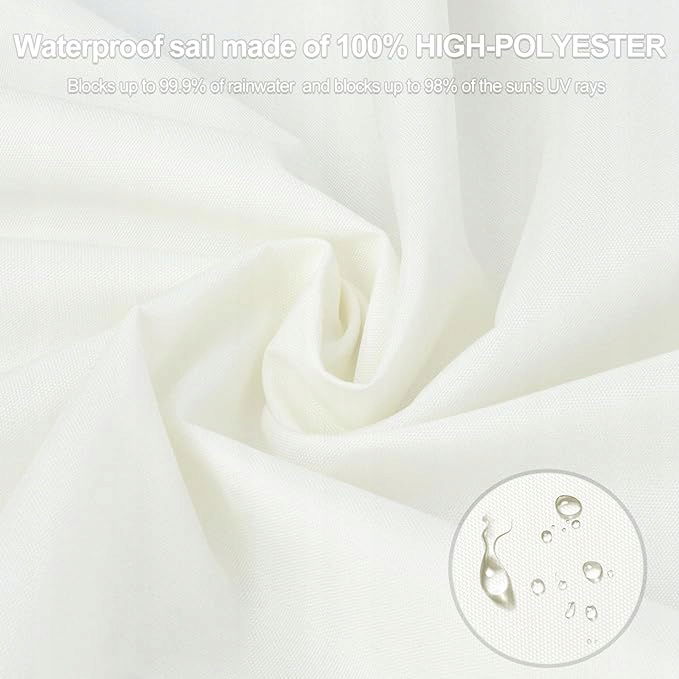 【99.9% Wodoodporny】- Żagiel cieniujący posiadają bryzgoszczelną powłokę na powierzchni tkaniny i podwójną powłokę PU od wewnątrz. Osłona przeciwsłoneczna składa się z trzech kawałków materiału. Szwy tkaniny są zabezpieczone klejem do prasowania na gorąco. Zapobiega przenikaniu wody przez szwy. Odporność na ciśnienie wody: 400mm HH - 600mm HH