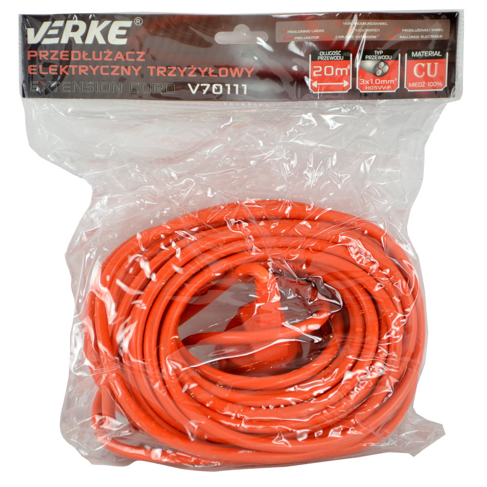 Przedłużacz marki Verke z uziemieniem oraz grubą izolacją zewnętrzną w kolorze pomarańczowym o długości 20 metrów, przeznaczony do zasilania urządzeń elektrycznych o napięciu do 250 V.
