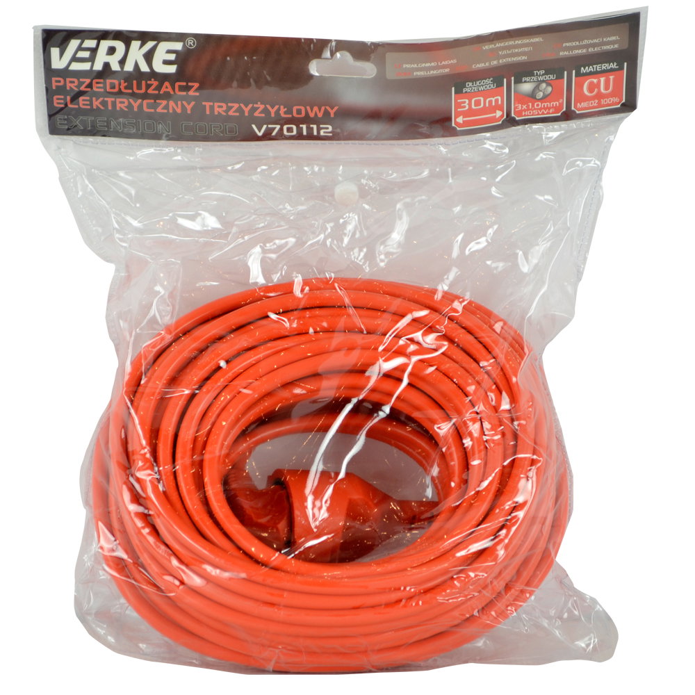 Przedłużacz marki Verke z uziemieniem oraz grubą izolacją zewnętrzną w kolorze pomarańczowym o długości 30 metrów, przeznaczony do zasilania urządzeń elektrycznych o napięciu do 250 V.