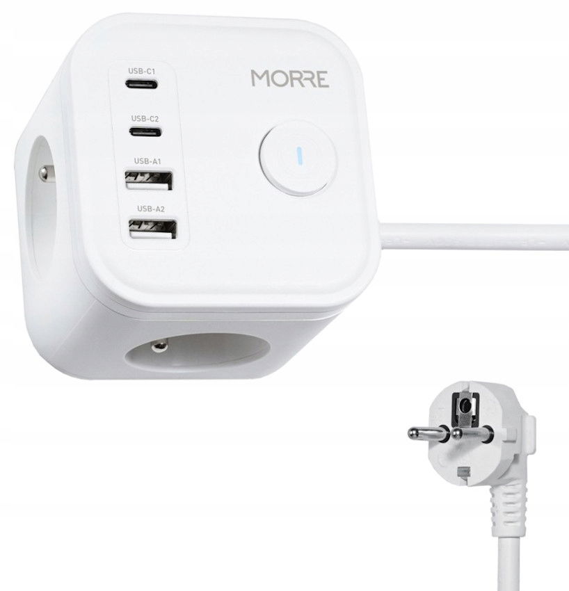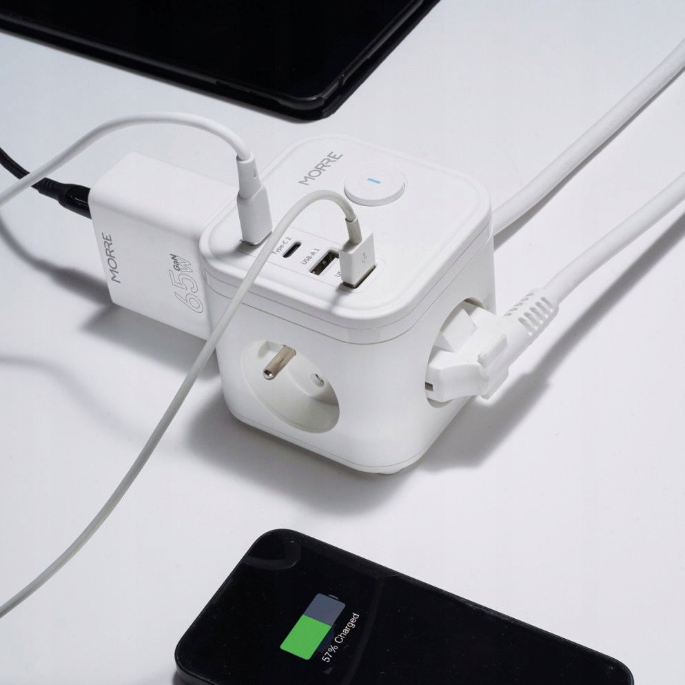 Trzy gniazda AC umieszczone na różnych bokach kostki oraz cztery porty USB (2× USB‑A 12 W, 2× USB‑C 15 W) pozwalają jednocześnie zasilić lampkę, laptop, router oraz ładować smartfon, tablet, słuchawki i powerbank.