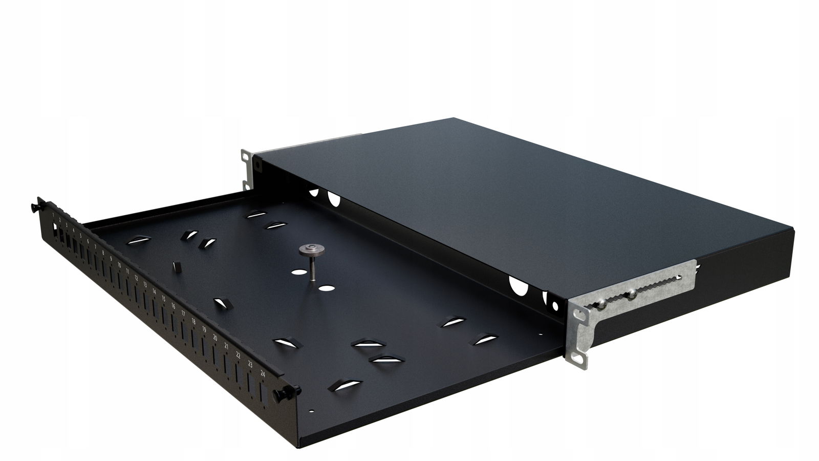 Dzięki wysuwanej konstrukcji szuflady ułatwia dostęp do połączeń światłowodowych, co znacznie przyspiesza konserwację, rekonfigurację sieci oraz instalację.