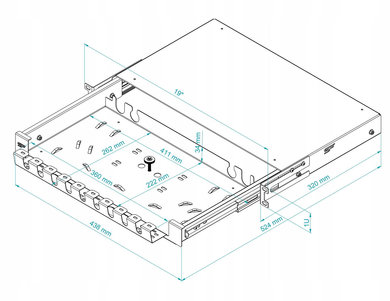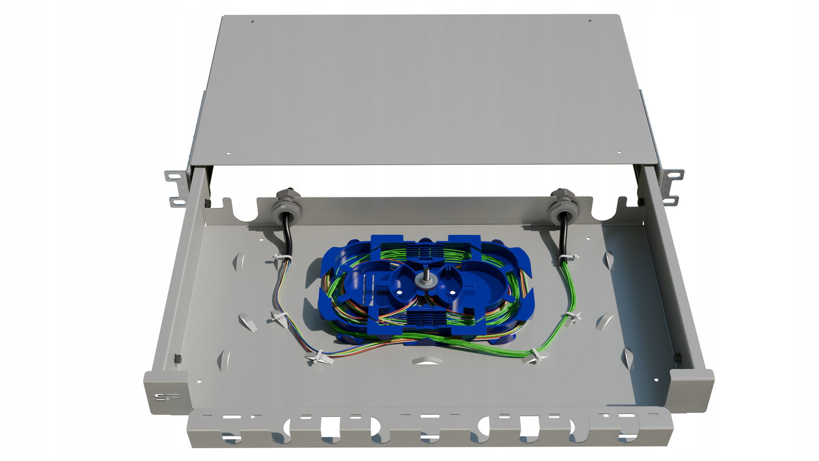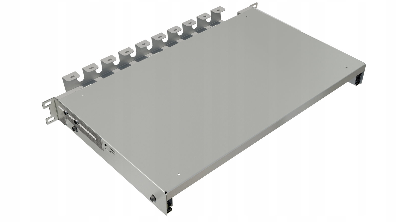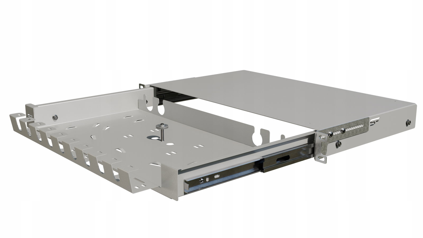Szuflada posiada pręt gwintowany M5/30 do montażu tacek światłowodowych oraz przetłoczenia w dnie, które ułatwiają mocowanie kabli. Idealnie nadaje się do spawania światłowodów, zapewniając szybki dostęp i porządek w kablach. Wykonana z malowanej proszkowo stali, jest trwała i odporna na uszkodzenia, a jej kompaktowa konstrukcja pozostawia miejsce na inne urządzenia w szafie.