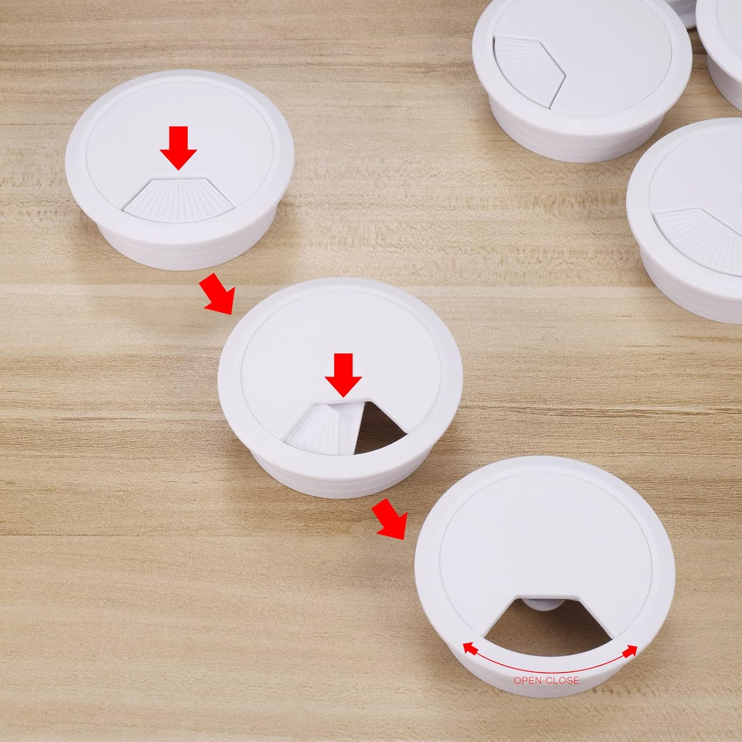 Meblowa przelotka pozwalająca utrzymać porządek w przewodach na biurku i w szafkach. Średnica 60 cm, płynnie uchylny otwór, możliwość całkowitego ściągnięcia klapy osłonowej w celu umieszczenia większego pęku kabli.