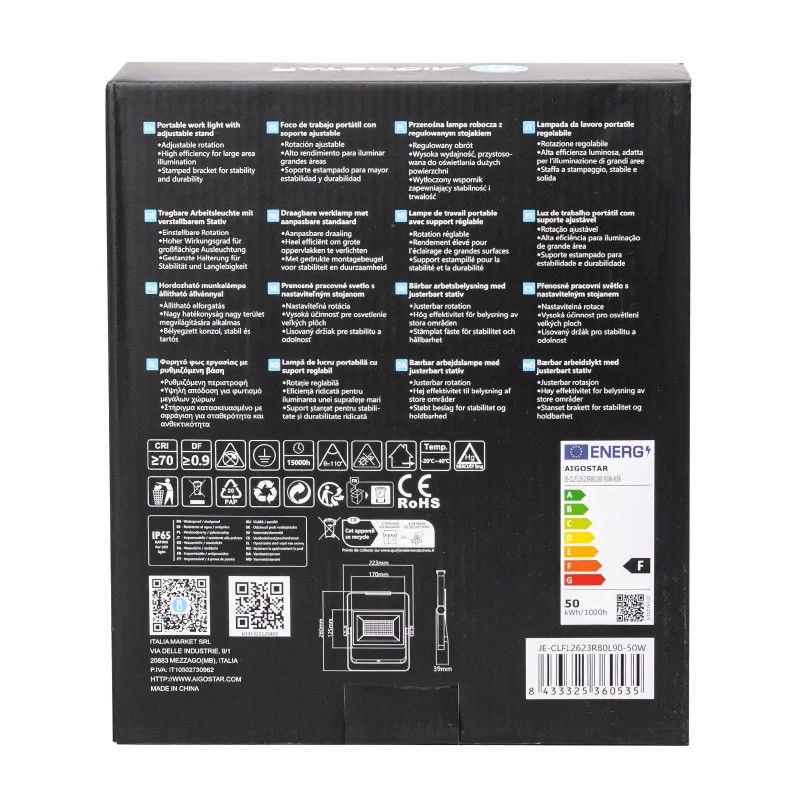 Zastosowano wzmocnione szkło hartowane o wysokiej przepuszczalności, które charakteryzuje się dobrą przepuszczalnością światła, równomiernym i przezroczystym światłem, wodoodpornym i niełatwym do złamania. Regulacja kąta promieniowania 360° zapewniają precyzyjne oświetlenie, spełniają więcej potrzeb oświetleniowych. Składana konstrukcja uchwytu, która może być używana jako oświetlenie wiszące, oświetlenie przenośne i oświetlenie podłogowe oraz szeroki zasięg oświetlenia. Przenośna konstrukcja, szerokie zastosowanie, odpowiednia do krajobrazu na zewnątrz, części w pomieszczeniach zamkniętych, na placu budowy i w innych miejscach.