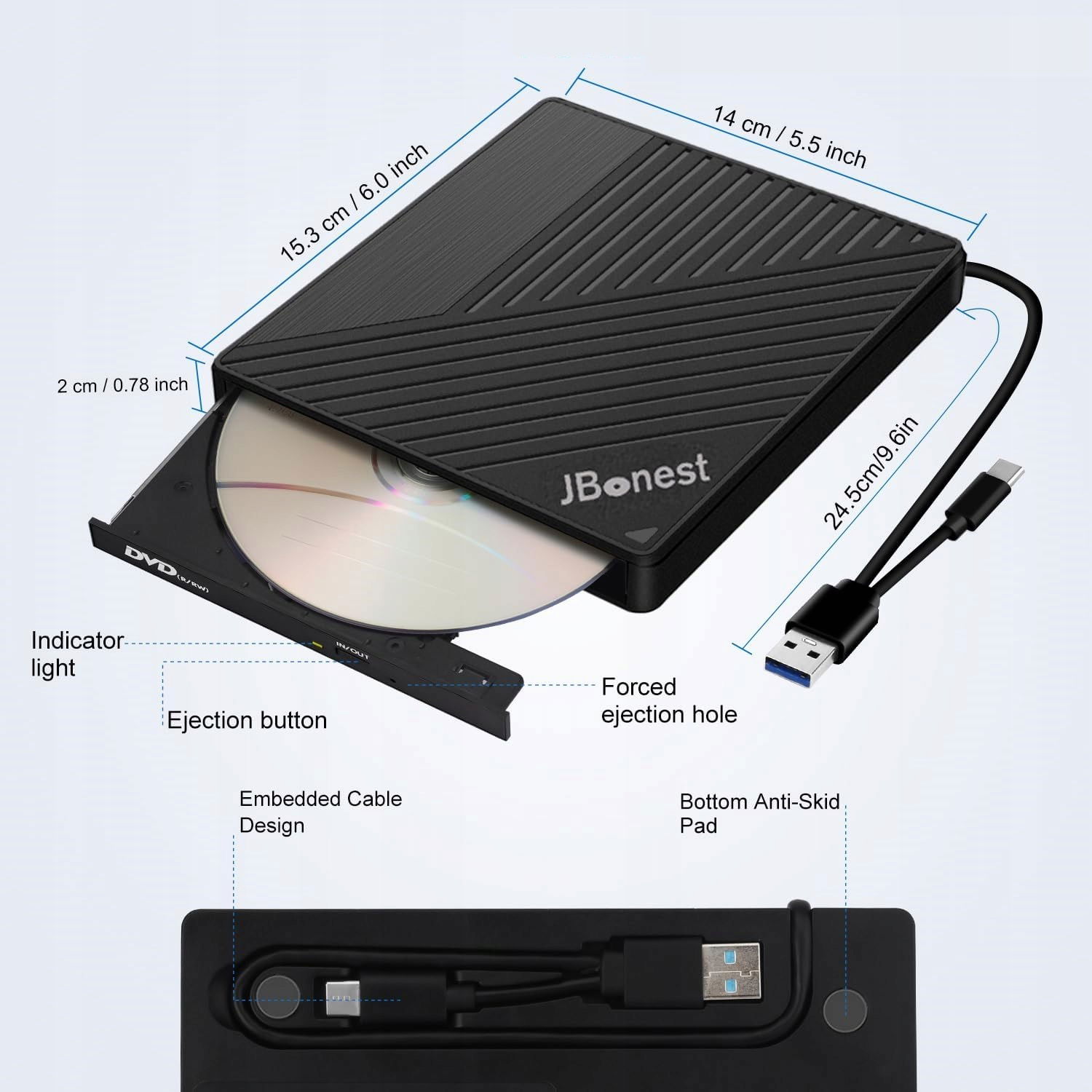 JBonest Zewnętrzny Napęd CD DVD USB 3.0 typu C – Przenośna Nagrywarka DVD RW z Czytnikiem Kart SD/TF, Szybki Transfer Danych do Laptopów, Komputerów Stacjonarnych, MacBook, Win11/10/8/7/XP, Linux, Mac OS, Vista �✍️