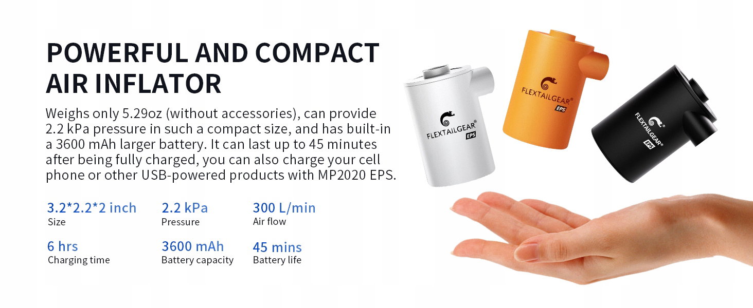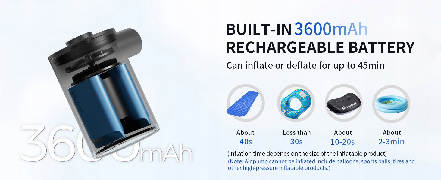 Najsilniejsza moc: lekka pompa powietrza zawiera baterię 3600 mAh, dzięki czemu może pracować nieprzerwanie przez 40 minut. Funkcja Deflate może szybko opróżnić się, aby zaoszczędzić czas, szeroko stosowana na plaży, kempingu i imprezach plenerowych
