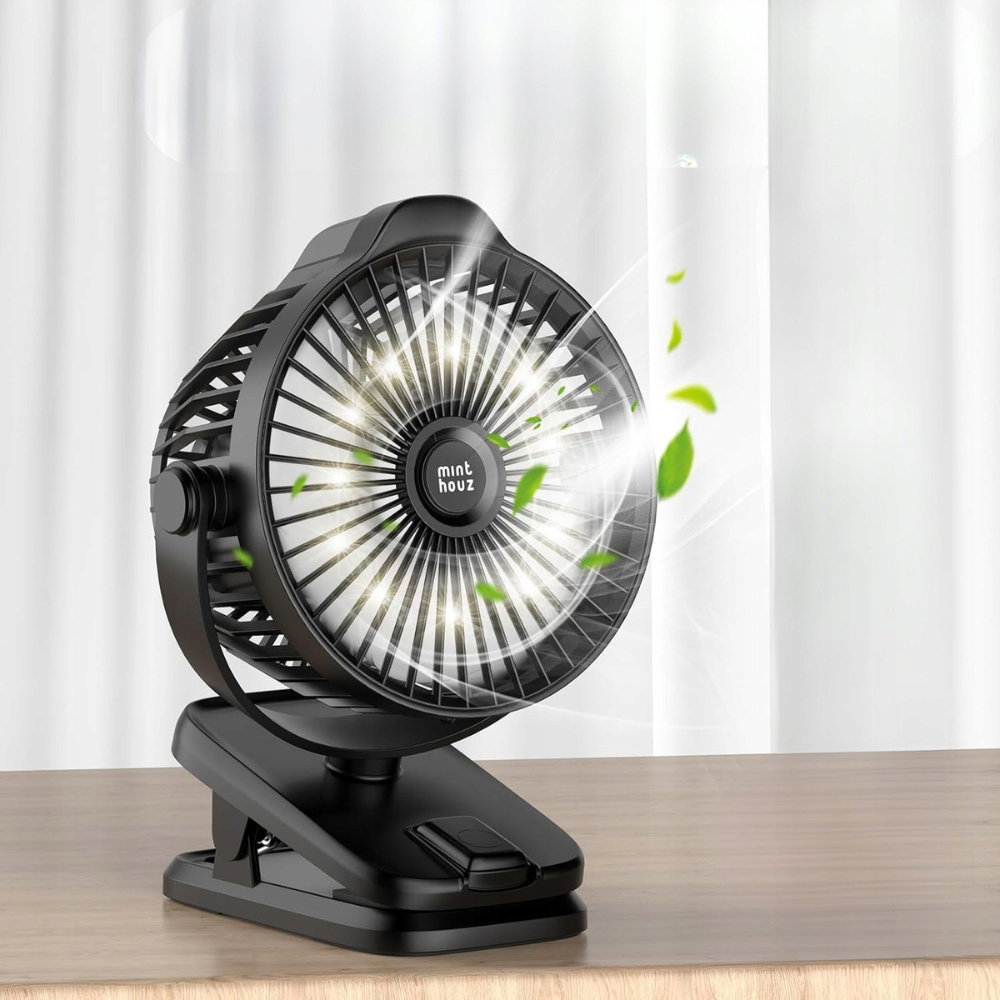 Wentylator Minthouz Clip-on – przenośny mały wentylator z obrotem 720°, cyfrowym wyświetlaczem LCD i akumulatorem 8000 mAh, cichy wentylator biurkowy do użytku na zewnątrz, podczas biwakowania, do wózka dziecięcego, domu lub biura