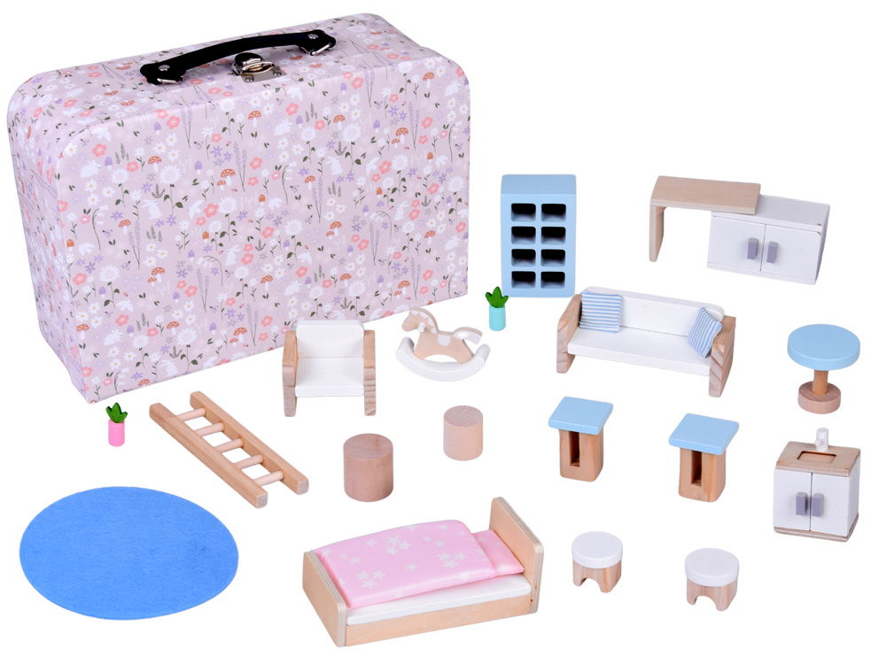 Ta urocza zabawka, domek w walizce z drewnianymi mebelkami, przenosi dzieci w świat pełen magii i inspiracji. Dwupiętrowy domek oferuje sypialnię z miękkim łóżeczkiem i kuchnio-salon z kompletnym wyposażeniem. Zestaw zawiera meble, poduszki, dywan, regał i wiele innych detali, wykonanych z solidnych materiałów. Domek jest praktyczny, łatwy do przenoszenia i idealny do zabawy zarówno w domu, jak i w podróży. To doskonały prezent rozwijający wyobraźnię i kreatywność, zachwycający dzieci i dorosłych. Harmonia stylu, funkcjonalności i ponadczasowego designu gwarantuje wiele radości i inspirujących chwil.