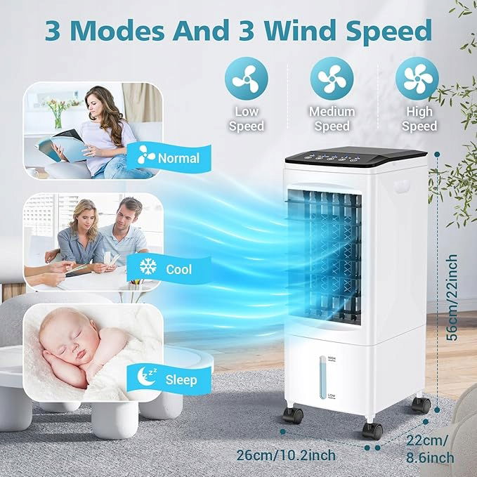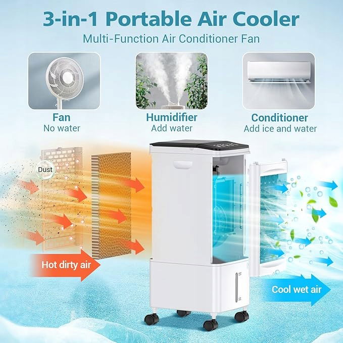 Przenośny klimatyzator 3w1 to wentylator, nawilżacz i klimatyzator w jednym. Oszczędza miejsce i energię, zapewniając przyjemny chłód w Twoim domu.