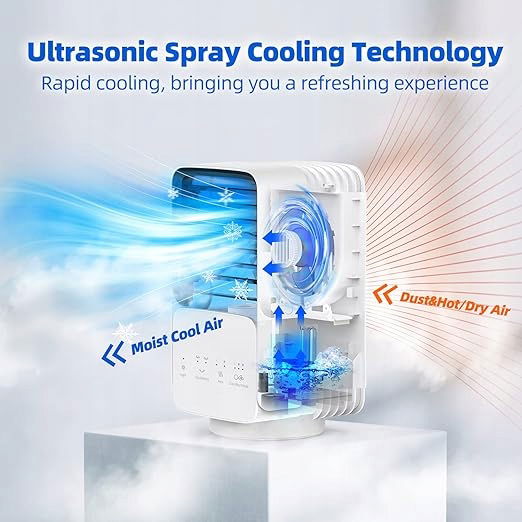 - ❄ Zaawansowana Technologia chłodzenia ❄ Klimatyzator wykorzystuje najbardziej zaawansowaną technologię rozpylania ultradźwiękowego do rozpylania cząsteczek wody na drobne cząsteczki, zapewniając świeże i wilgotne powietrze. Pożegnaj się z suchością skóry, przekrwienie błony śluzowej nosa i kaszlem spowodowanym suchym letnim powietrzem. Możesz wybrać jeden z dwóch trybów natryskiwania, aby spełnić Twoje potrzeby i preferencje.