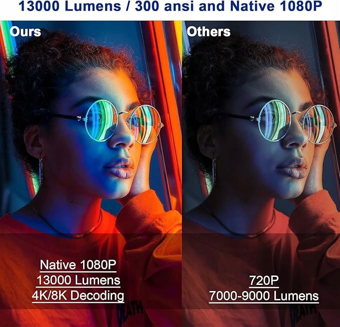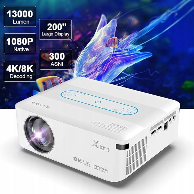 Projektor oferuje natywną rozdzielczość 1920x1080P oraz obsługę dekodowania 4K i 8K, co zapewnia wyjątkową ostrość i bogate kolory. Dzięki jasności 13000 lumenów obraz jest wyraźniejszy i bardziej realistyczny. Technologia Dolby Audio gwarantuje wysoką jakość dźwięku, oddając każdy szczegół i tworząc kinowe wrażenia w domu i na świeżym powietrzu.