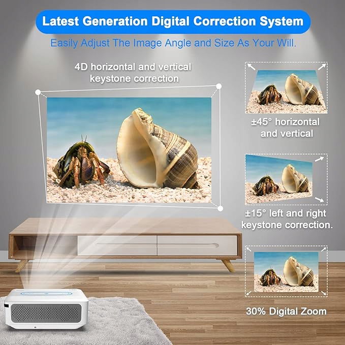 Zaawansowana korekcja trapezowa 4D/4P pozwala dostosować obraz zarówno w pionie, jak i poziomie, niezależnie od kąta projekcji. Możliwość skalowania obrazu do 30% pozwala łatwo dostosować wielkość ekranu, który może osiągać nawet 200 cali. Wysoki kontrast 10000:1 zapewnia szczegółowy i realistyczny obraz bez strat jakości.