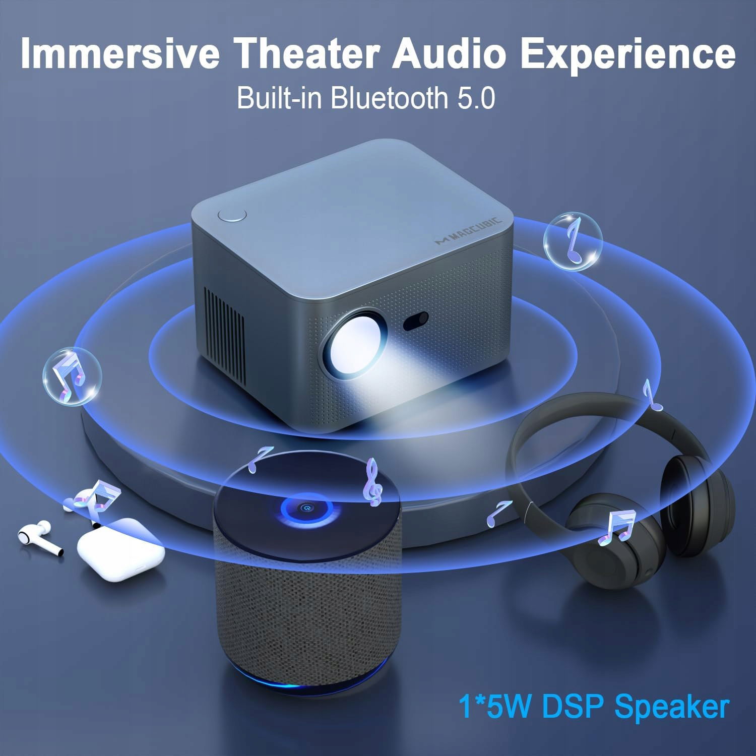 Projektor Magcubic HY350 obsługuje najnowszy standard WiFi 6, co zapewnia stabilne i szybkie przesyłanie strumieniowe bez opóźnień. Dzięki modułowi Bluetooth 5.0 możesz bezproblemowo połączyć słuchawki, głośniki, soundbary czy AirPods, uzyskując jeszcze lepsze wrażenia dźwiękowe. Wbudowane podwójne głośniki stereo 5W zapewniają czysty i mocny dźwięk.