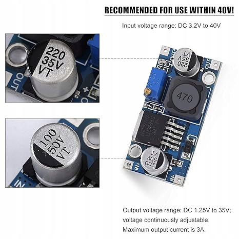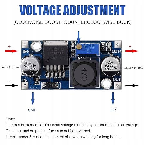 Zakres napięcia wejściowego: DC 3,2 V do 40 V. Napięcie wejściowe musi być o 1,5 V wyższe od napięcia wyjściowego. Nie można go podbić.