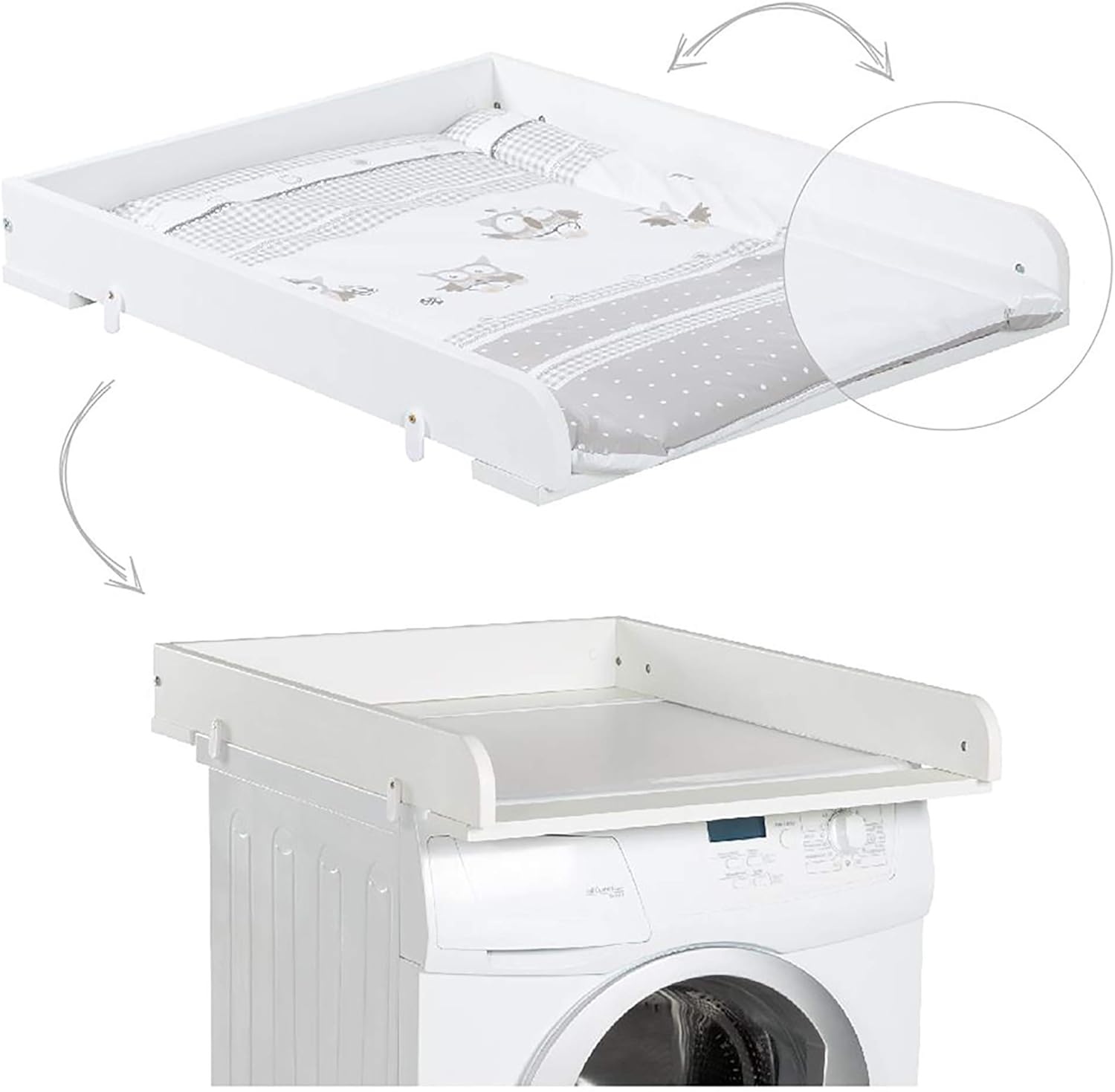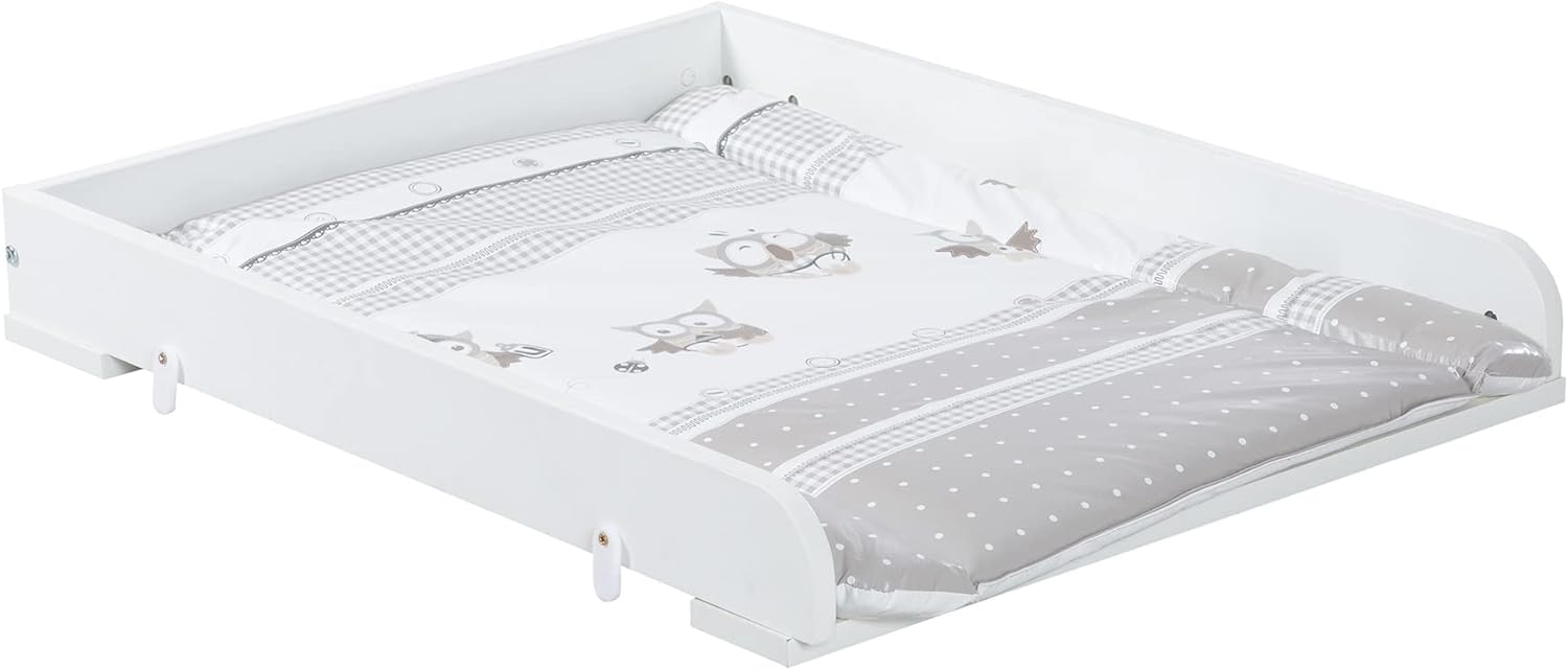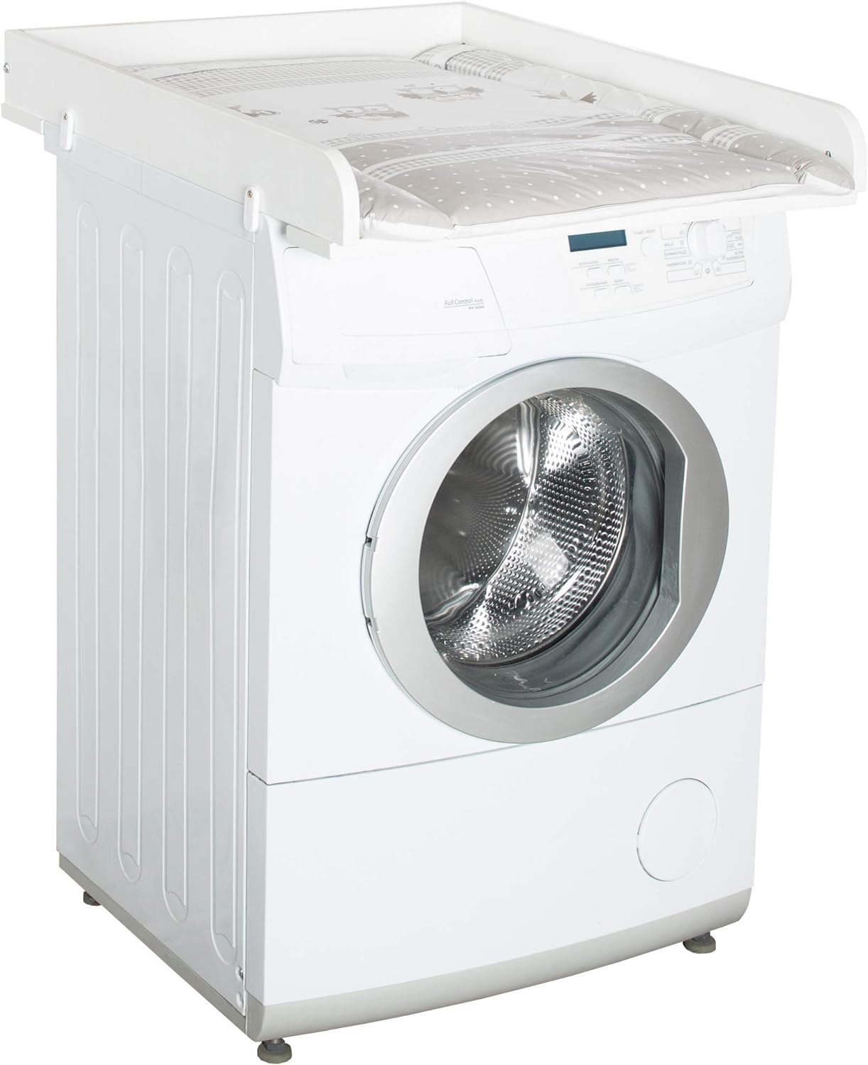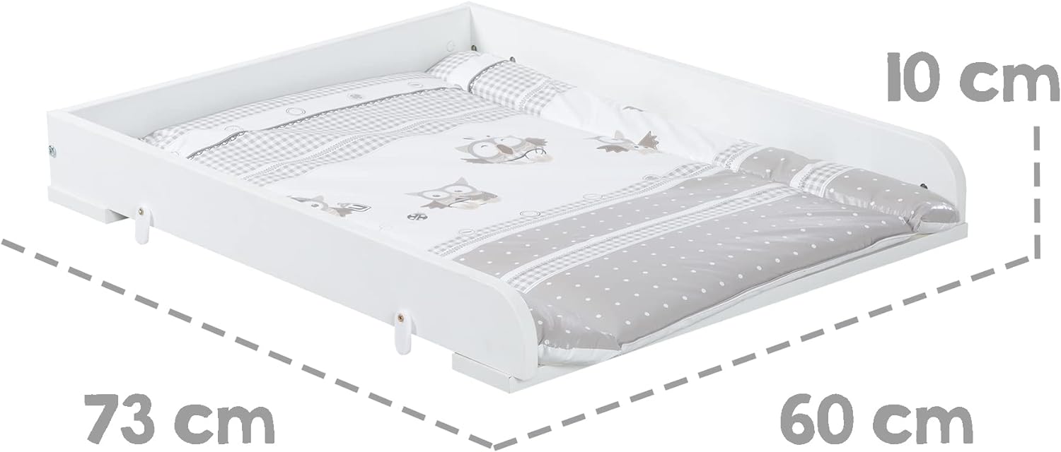 Dla optymalnej przyczepności pralka powinna mieć szerokość 60 cm i głębokość 53-54 cm. W zestawie znajduje się miękka nakładka na przewijak z obiciem PU o harmonijnym wzornictwie "eulenbabys grau". Podkład do przewijania o wymiarach 54 x 74 x 4,5 cm (szer. x gł. x wys.) jest wykonany z mocnej, odpornej na rozerwanie folii (bez ftalanów) ze specjalną techniką szycia, dzięki czemu jest wyjątkowo wytrzymały. Miękkie wypełnienie wokół podwyższonej krawędzi chroni dziecko podczas przewijania. Spód jest wykonany z białej folii, co umożliwia dwustronne użycie tego podkładu. Nasza płyta do przewijania jest odpowiednia dla dzieci do 12 miesięcy i o wadze do 11 kg. Wymiary płyty do przewijania – szerokość: 60 cm, głębokość: 74, 5 cm, wysokość 9,5 cm.