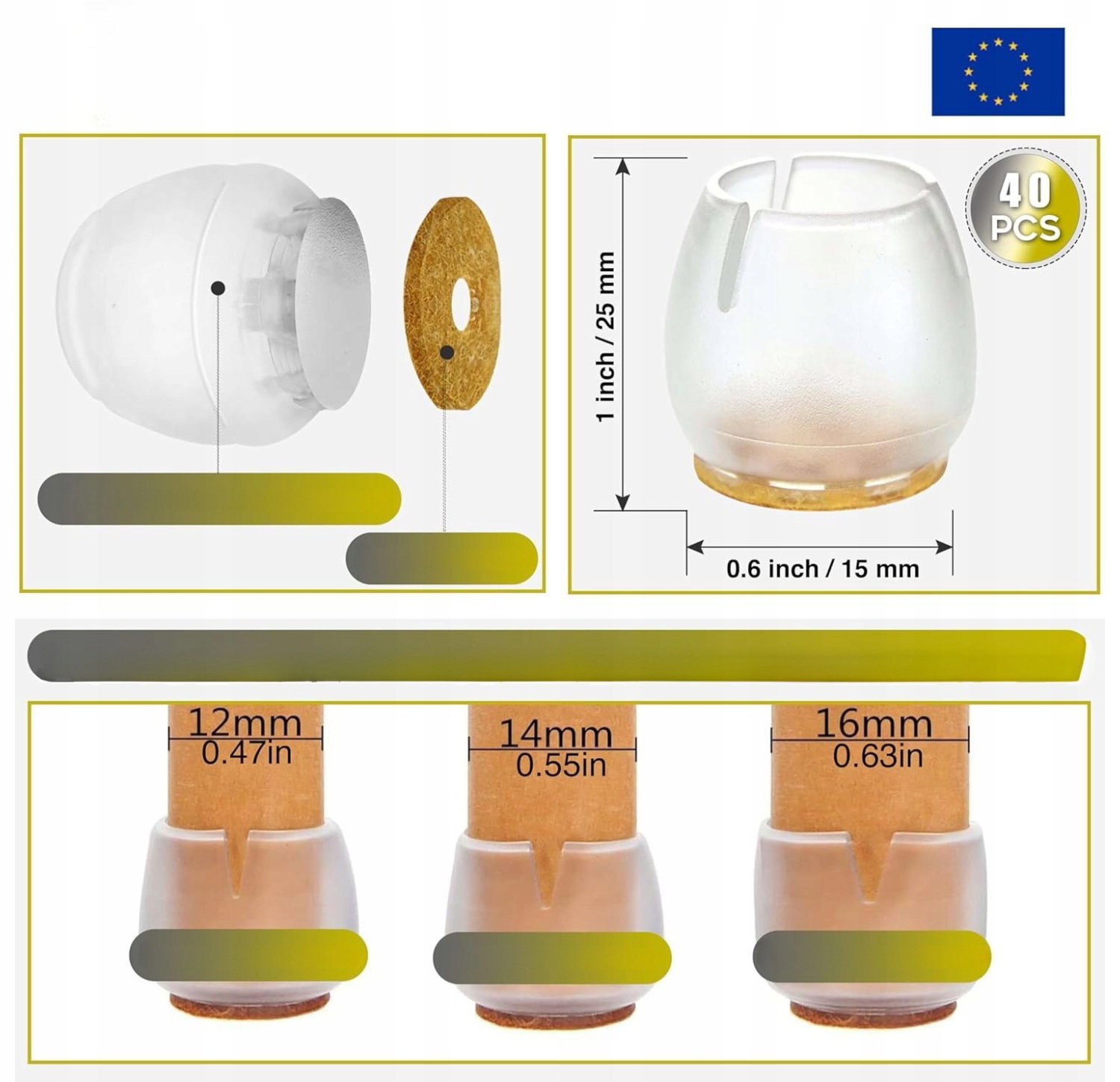 - Rozmiar: podkładkidopasowują się do nóg mebli o średnicy od 12 mm do 16 mm. Nie pasują, jeśli nóżka ma mniej niż 12 mm (0,47 cala) lub więcej niż 16 mm (0,63 cala).