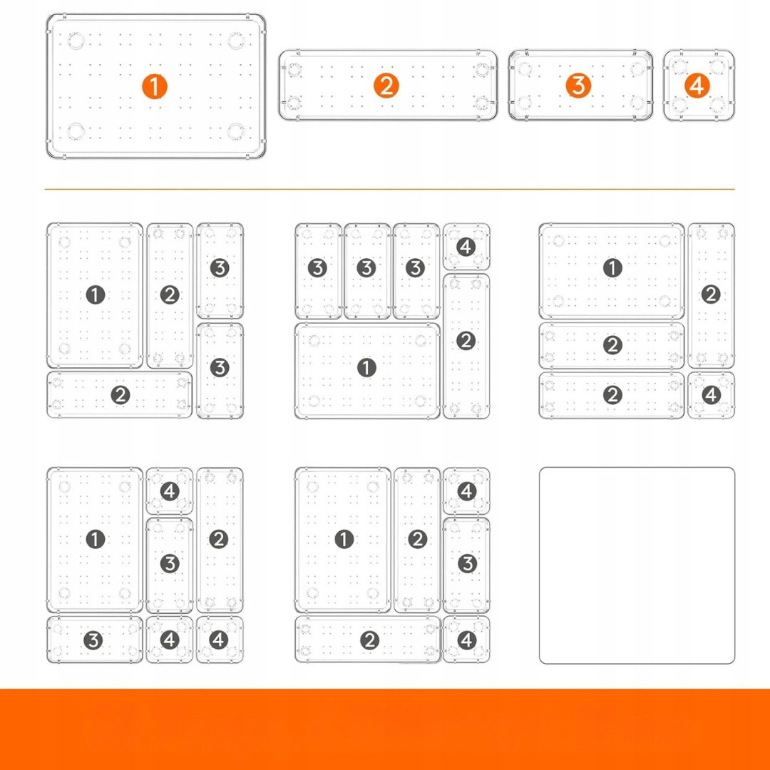 - Elastyczne dopasowanie i konfiguracja: zestaw składa się z 33 tacek w czterech różnych rozmiarach, które można dowolnie układać i dopasowywać w zależności od potrzeb. Tace łatwo dostosowują się do różnych rozmiarów szuflad, umożliwiając swobodne łączenie i konfigurowanie ich według preferowanego układu.