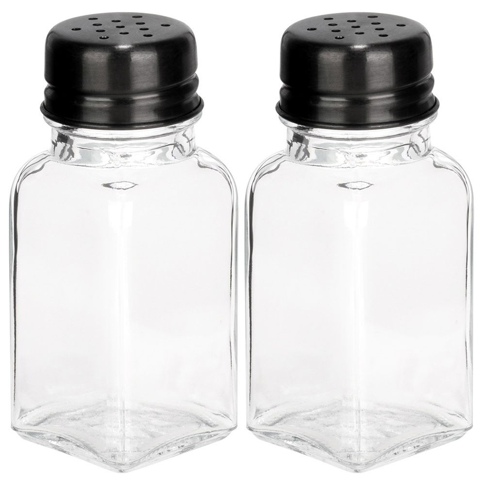 Solidnie wykonane - Pieprzniczka i solniczka wykonane są z grubego szkła w przezroczystym kolorze. Zakrętki wykonane z metalu w czarnym kolorze.
