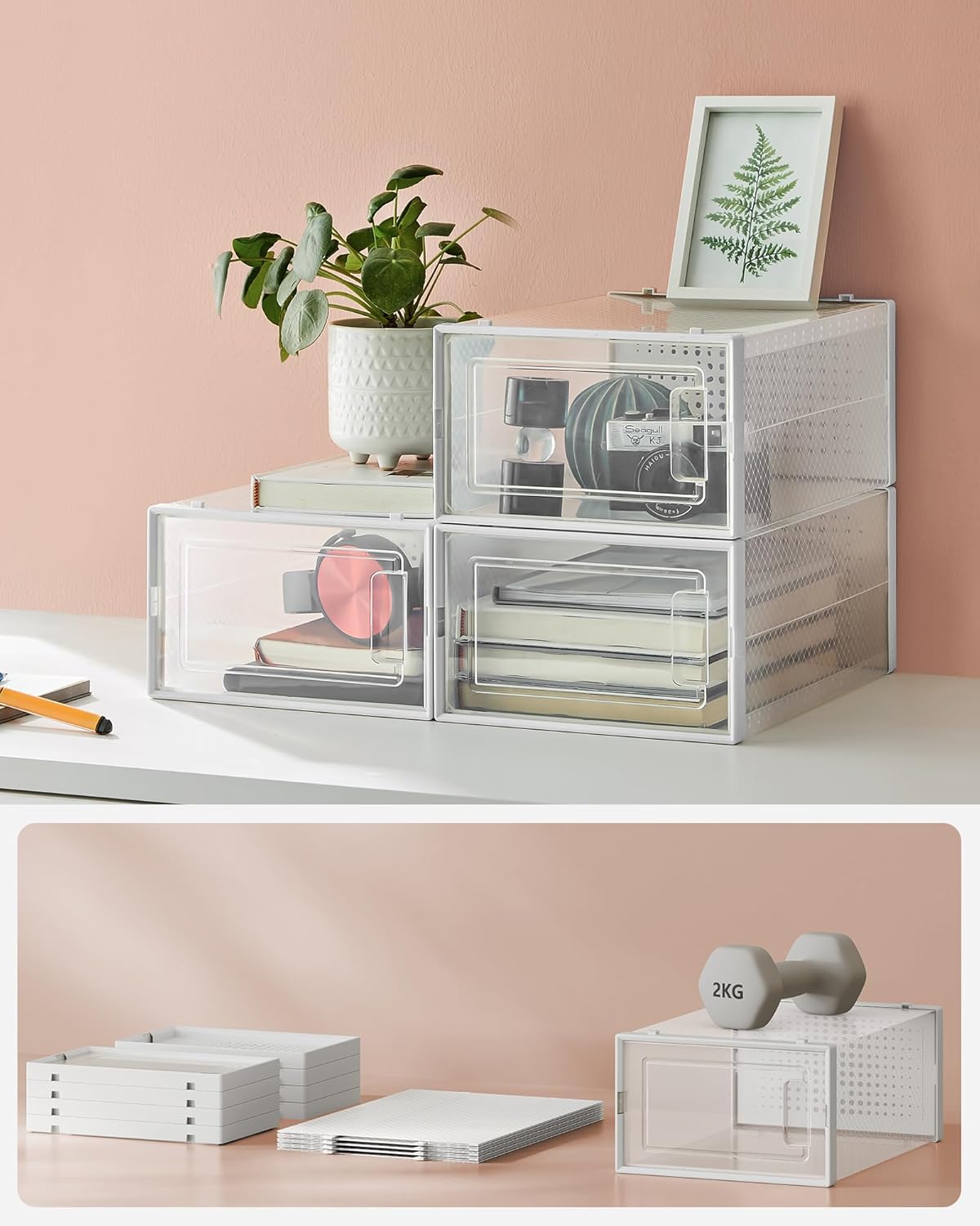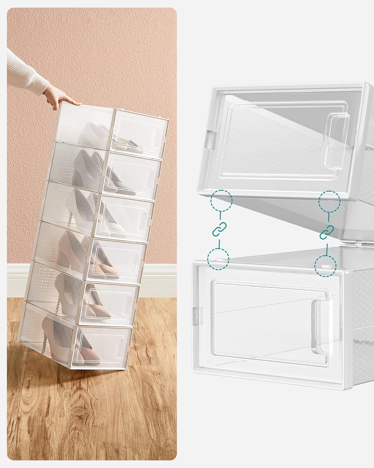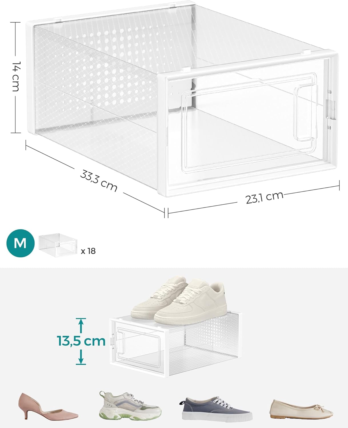 Co otrzymasz: 18 składanych, przezroczystych pudełek na buty, które posiadają drzwiczki oraz otwory wentylacyjne i mogą być ustawiane jedno na drugim, aby zaoszczędzić miejsce. Dzięki tym praktycznym pudełkom na buty możesz wreszcie pożegnać się z chaosem obuwniczym.