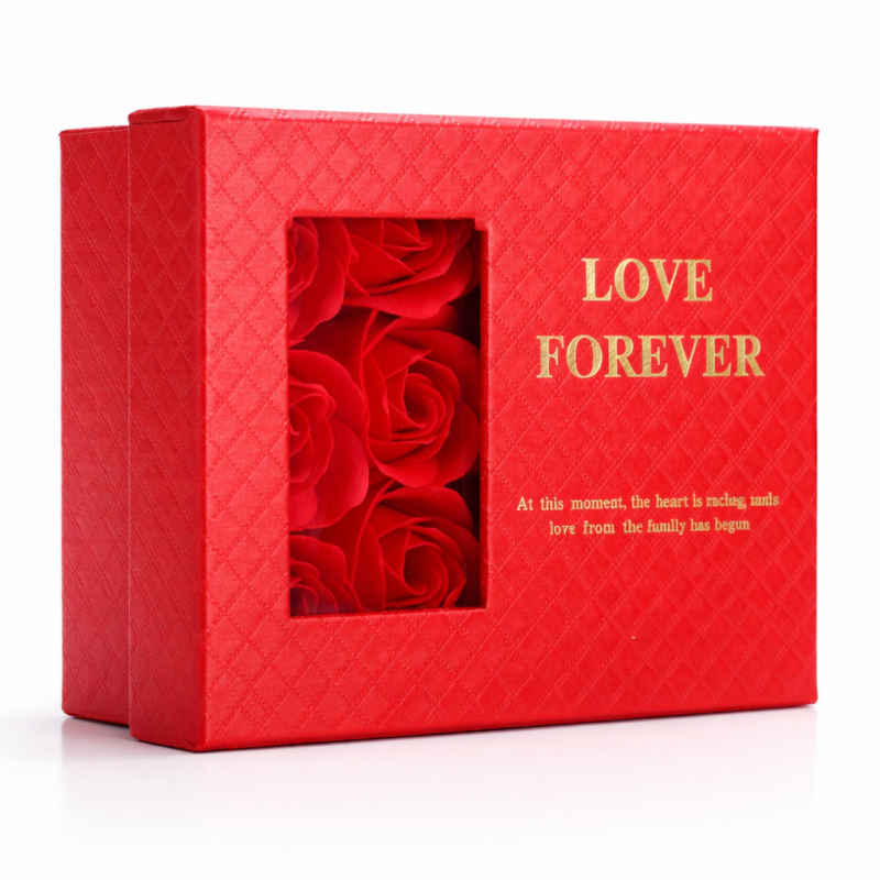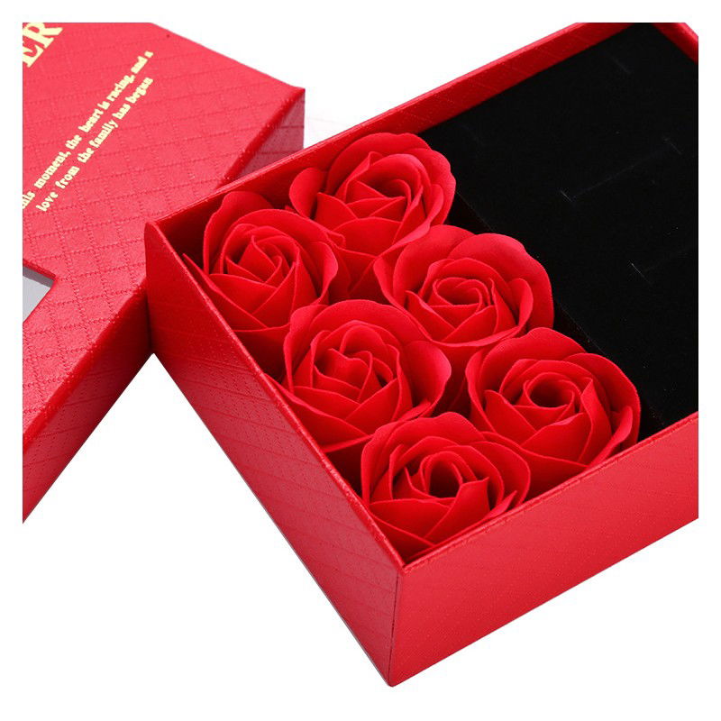 Eleganckie czerwone pudełeczko na biżuterię, idealne na drobne upominki dla ukochanej osoby, z 6 szt. zapachowych róż mydlanych, czerwone – idealny dodatek na Walentynki.