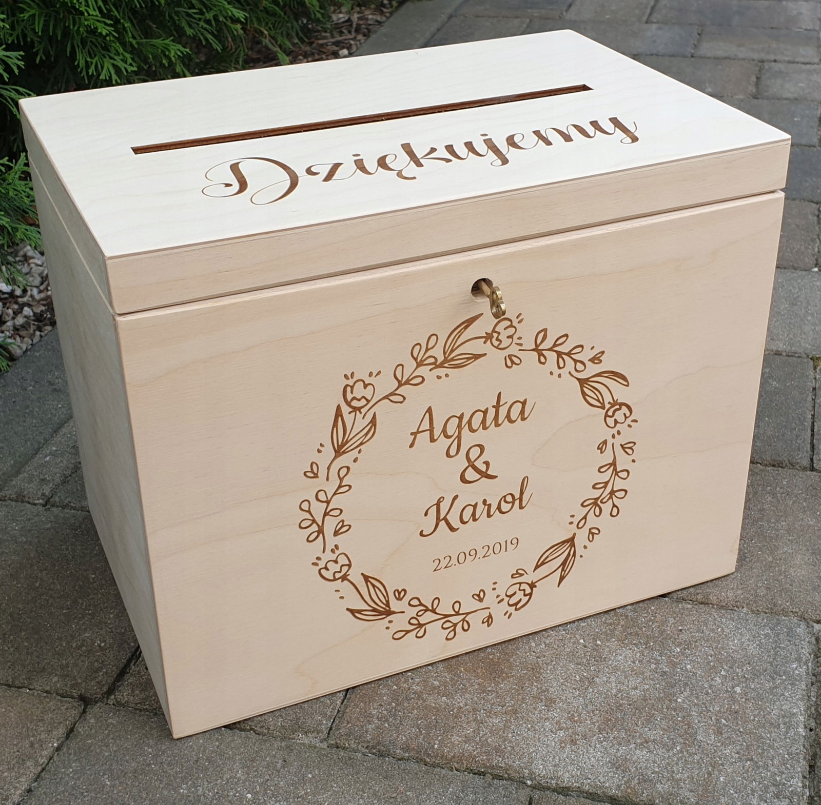 Pudełko drewniane NA KOPERTY ślubne z grawerem na froncie i wierzchu plus zamek z kluczykiem