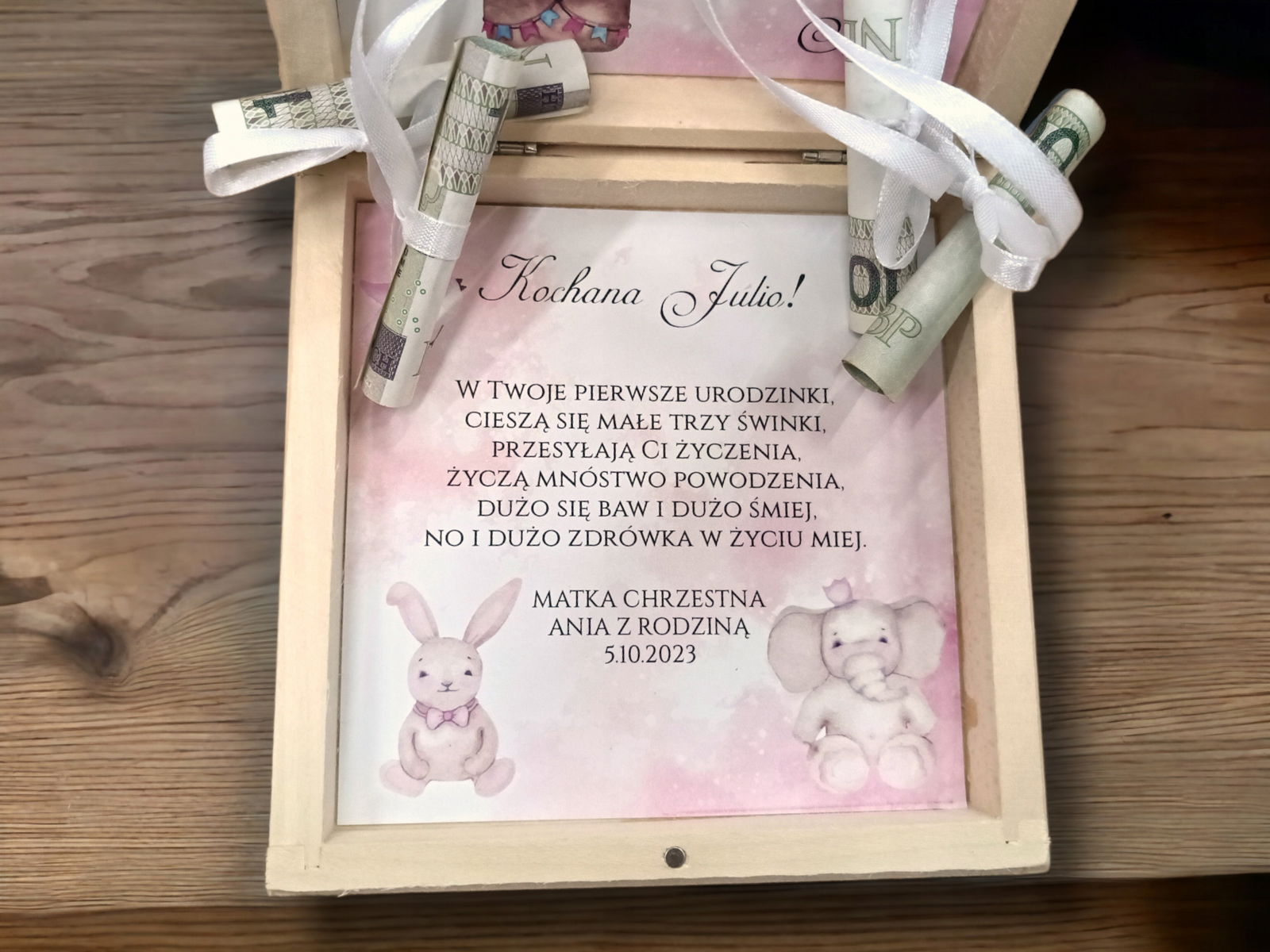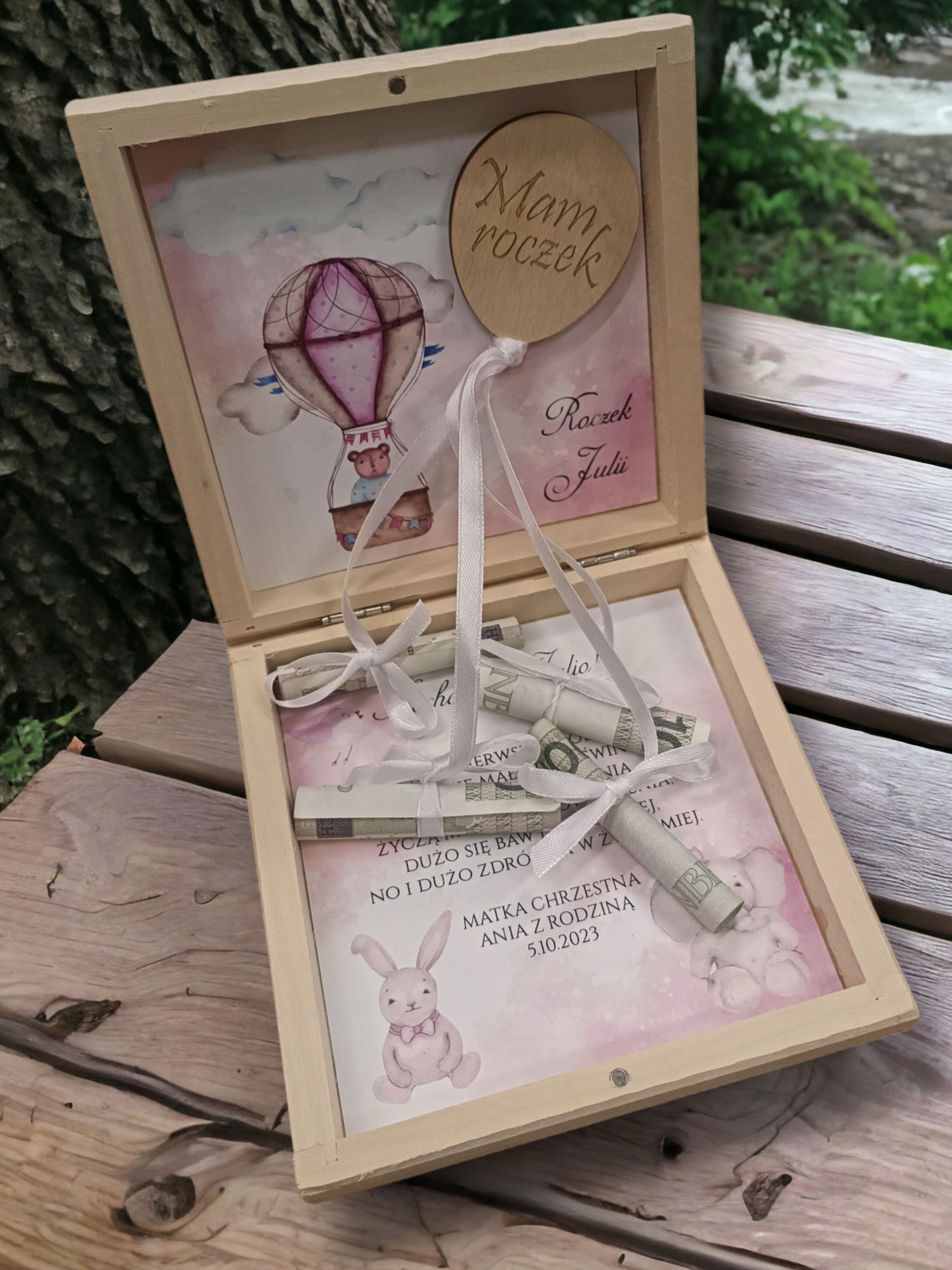 Drewniane pudełko na pieniądze - pierwsze urodziny , roczek