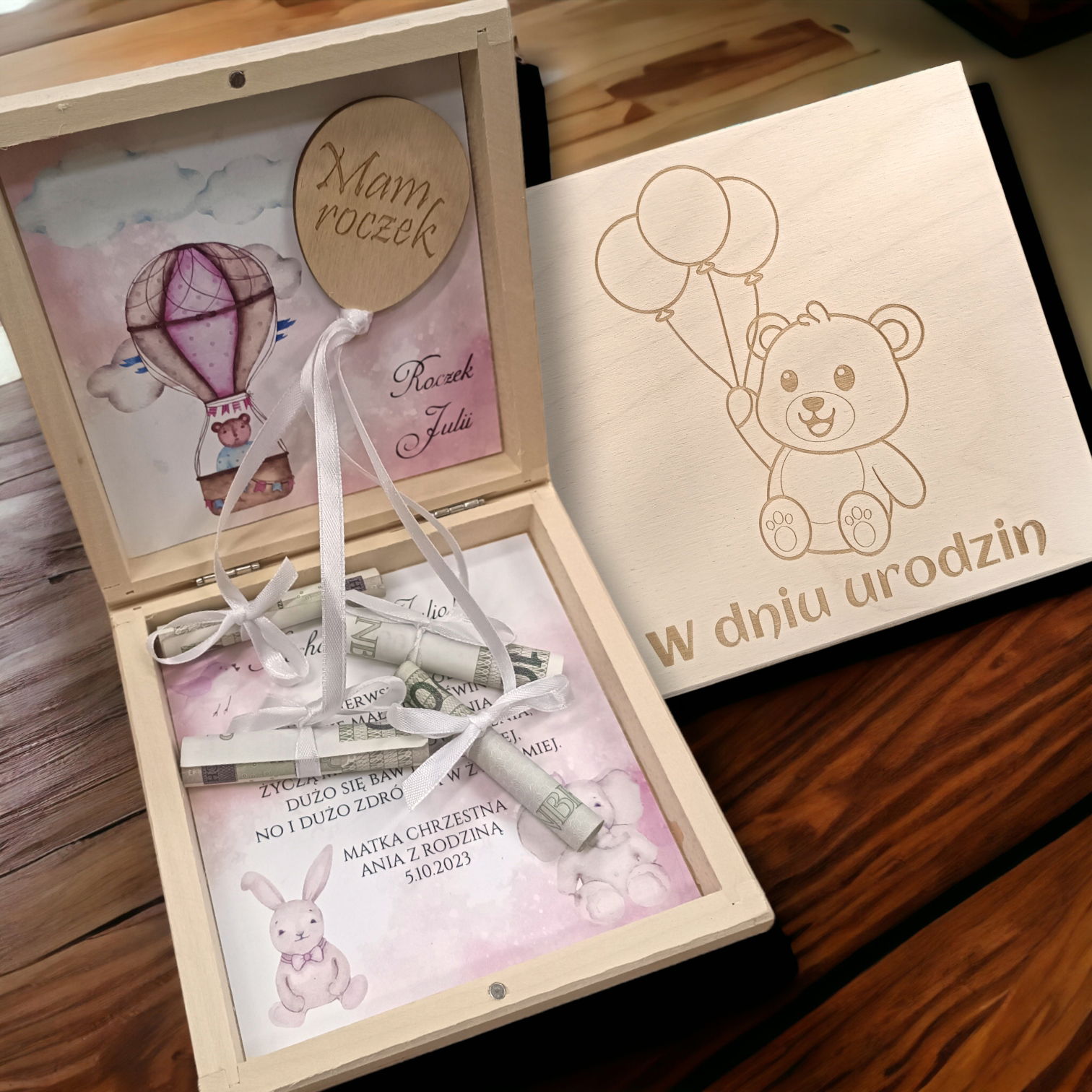 Drewniane pudełko na pieniądze - pierwsze urodziny , roczek