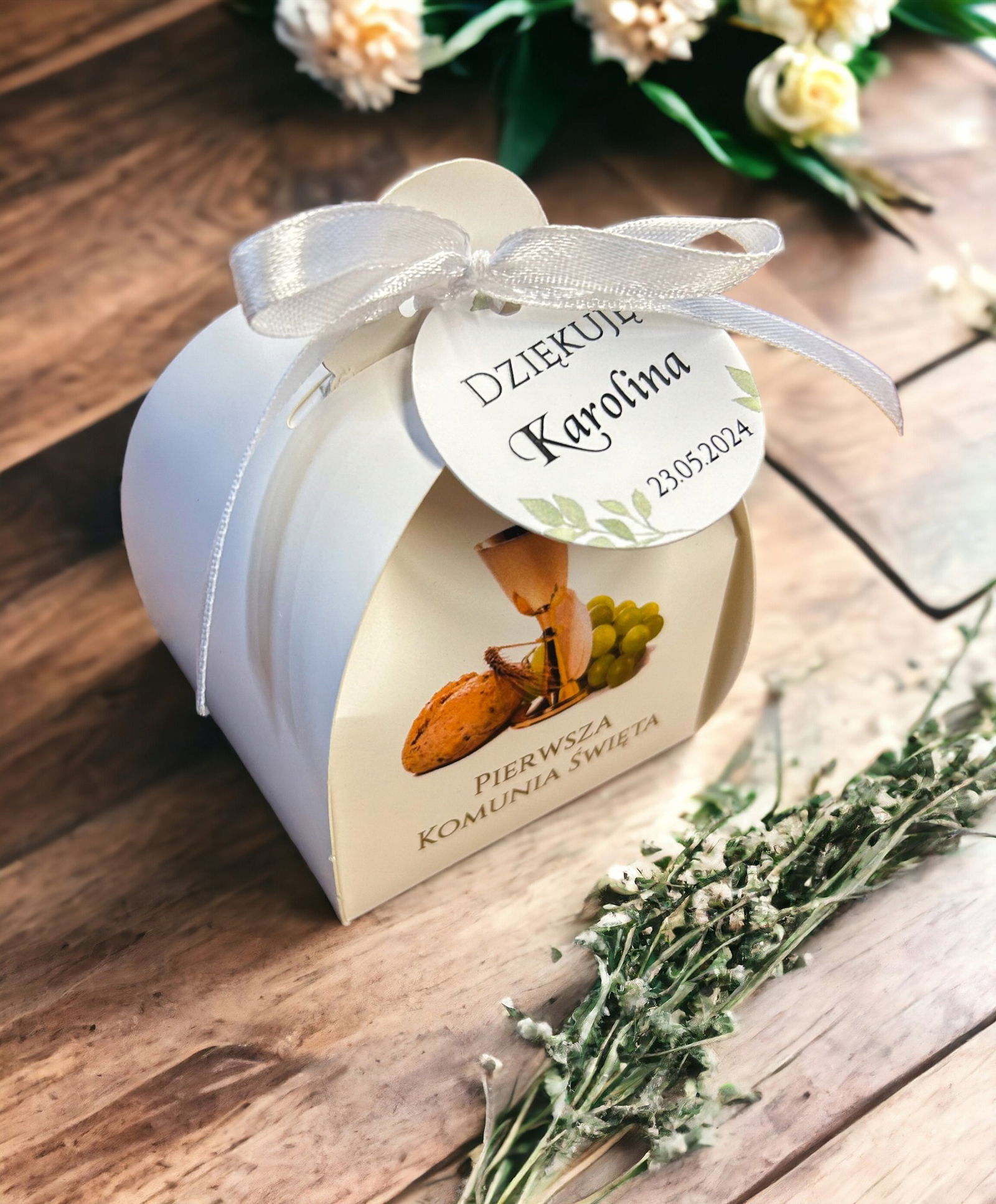 Eleganckie pudełko z imieniem i datą jako podziękowania to wyjątkowy podarunek dla Gości komunijnych.