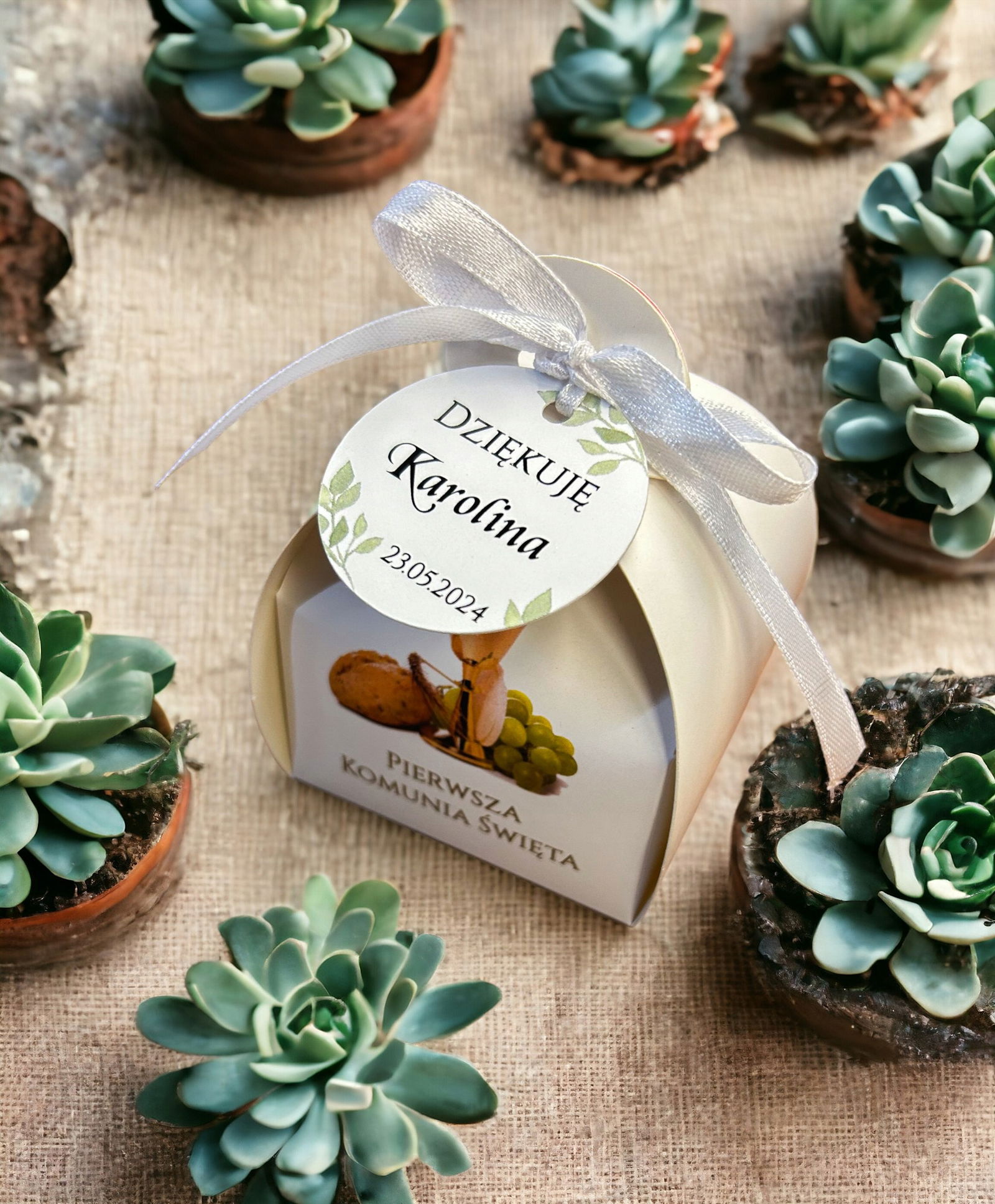 Eleganckie pudełko z imieniem i datą jako podziękowania to wyjątkowy podarunek dla Gości komunijnych.