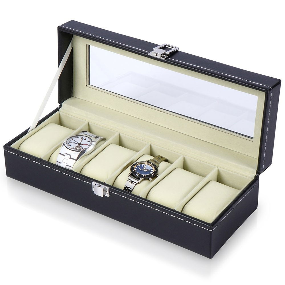 EFEKTOWNE - Praktyczne i eleganckie pudełko do przechowywania zegarków. Organizer ma wymiar zewnętrzny 30,5 x 11,5 x 8 cm.