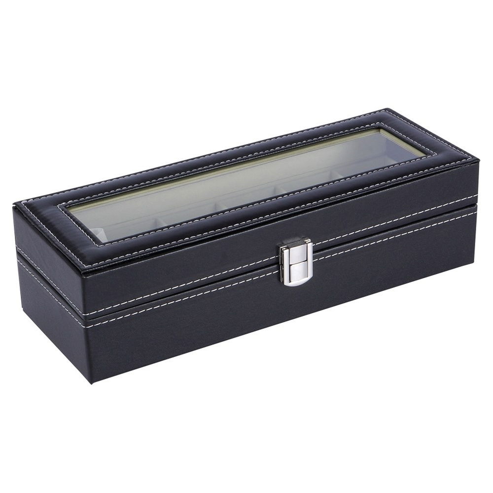 EKOLOGICZNA SKÓRA - Pudełko wykonane z ekologicznej skóry w czarnym kolorze. Posiada efektowne obszycie białą nicią. Pokrywka posiada szklaną szybkę, która umożliwia sprawdzenie zawartości pudełka bez konieczności otwierania go. Wyściółka w kolorze ecru wykonana jest z miłego w dotyku materiału.